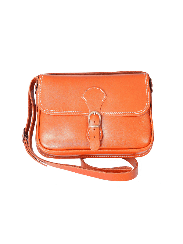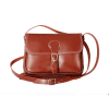 Bolso-bandolera de señora de piel cuero, cierre de hebilla y con solapa. Se puede hacer uso de bolso- cinturón, con medidas: 17,5 x 15 x 4 cm (ancho, altura y fondo).