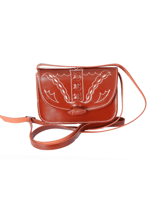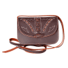 Bolso-bandolera de señora de piel picado, color marrón, con terminaciones picadas sobre fondo blanco, cierre de cordón, y con solapa. Se puede hacer uso de bolso- cinturón, con medidas: 17,5 x 15 x 4 cm (ancho, altura y fondo).