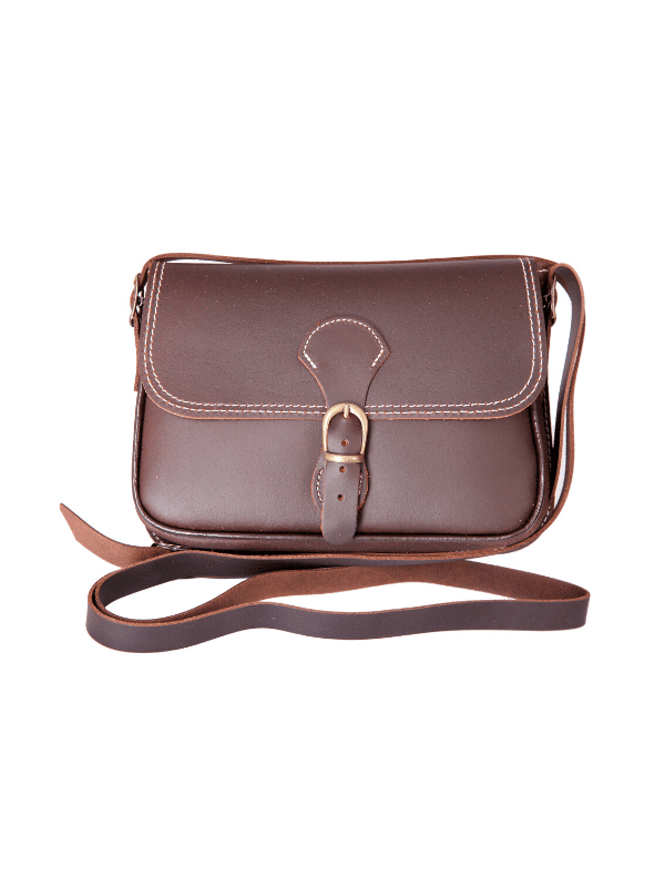 Bolso-bandolera de señora de piel, color marrón engrasado, cierre de hebilla y con solapa. Se puede hacer uso de bolso- cinturón, con medidas: 17,5 x 15 x 4 cm (ancho, altura y fondo).