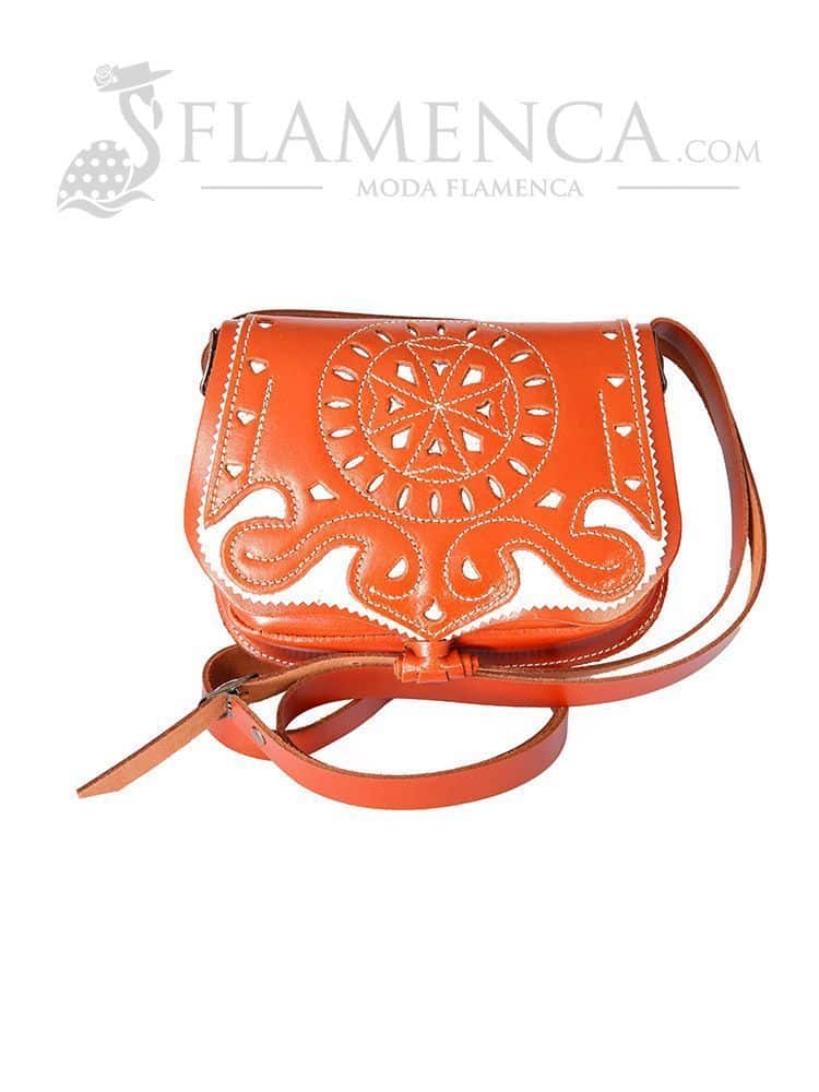 Bolso-bandolera de señora de piel picado, color cuero con fondo blanco, con solapa, cierre de cordón, y posible uso de bolso- cinturón, y con medidas: 17 x 13 x 5 cm (ancho, altura y fondo).