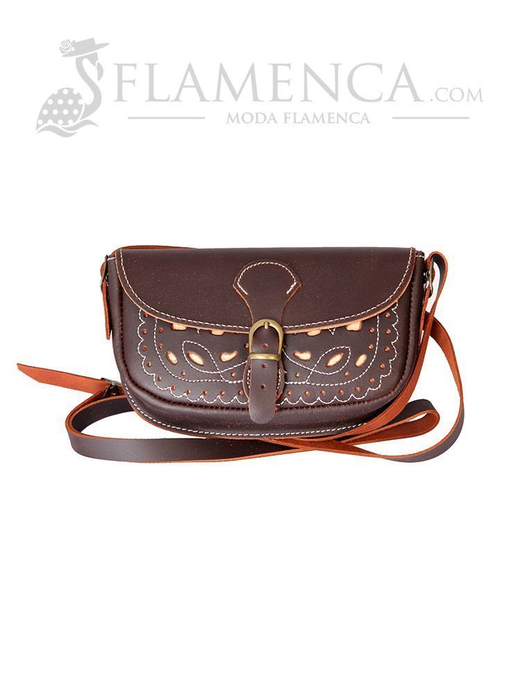 Bolso bandolera de señora en piel picado, con hebilla y terminación para hacerse cinturón, color marrón engrasado en fondo beige, y con medidas: 20 x 11 x 5 cm (ancho, altura y fondo).