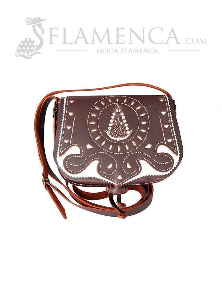 Bolso-bandolera de señora en piel picado, color marrón engrasado, con bordado de la virgen del rocío y terminaciones picadas en fondo blanco, con solapa, cierre de cordón, y posible uso de bolso- cinturón, y con medidas: 17 x 13 x 5 cm (ancho, altura y fondo).