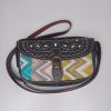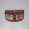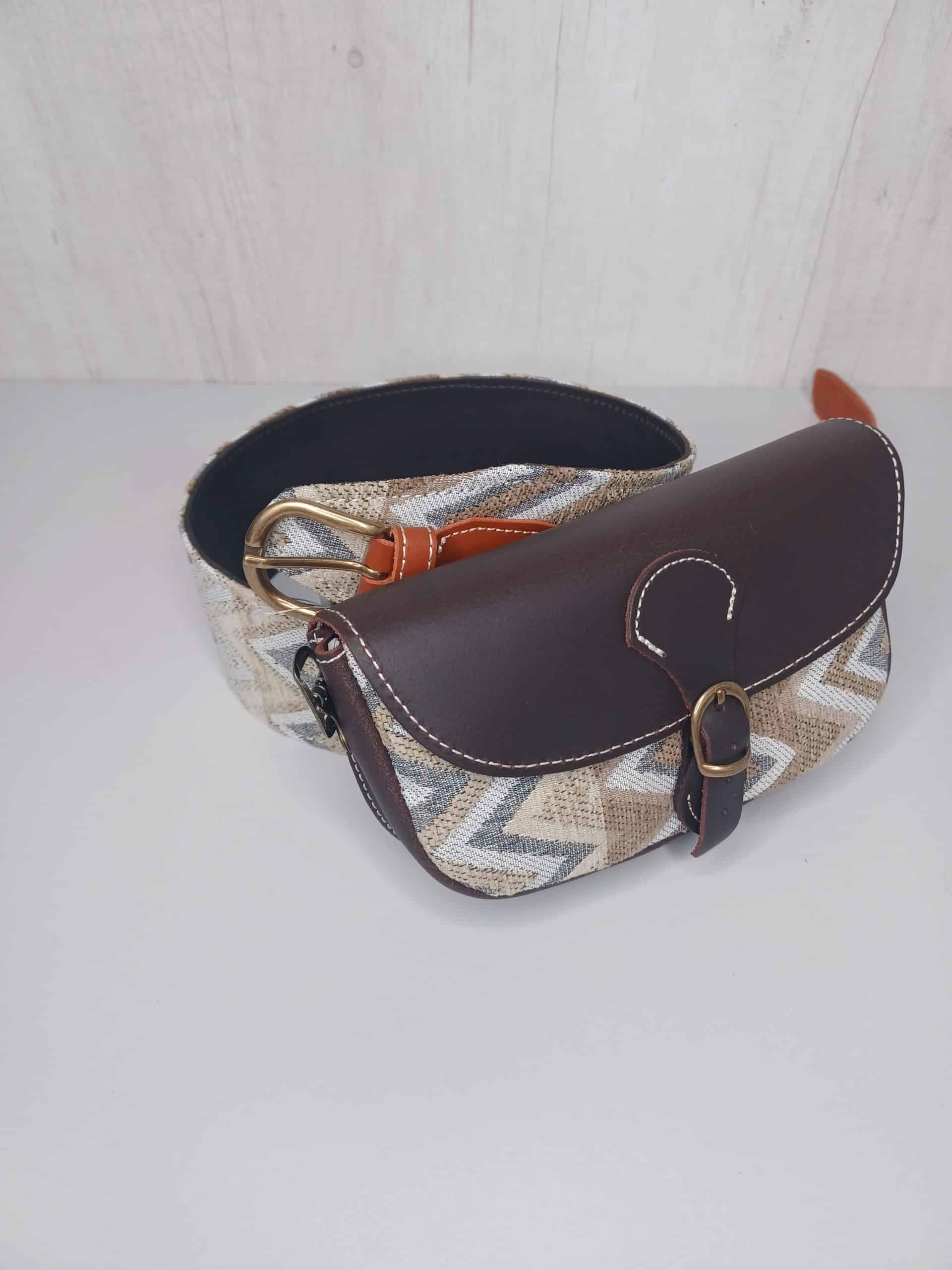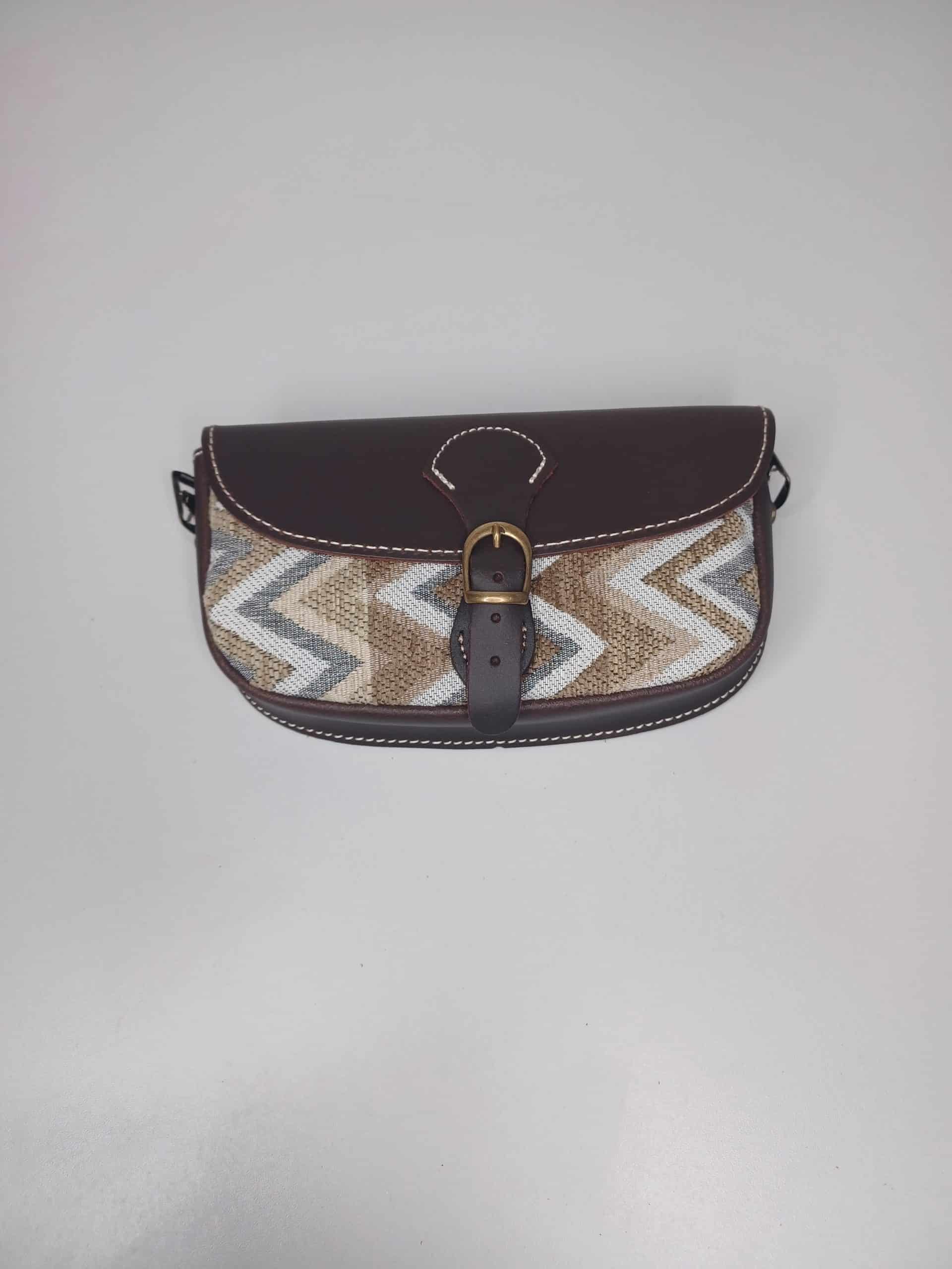 Bolso-bandolera de señora de piel. Fabricado artesanalmente en Ubrique, España. Color Engrasado estampado de formas geométricas, con solapa, cierre de hebilla, y posible uso de bolso- cinturón tipo riñonera. Ideal para el camino y romerías. Acompáñalo de su cinturón a juego.