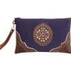 Cartera de mano de piel con exterior labrado sobre piel engrasada y terminaciones en blanco con fondo Azul Ducado. Fabricado artesanalmente en Ubrique, España.