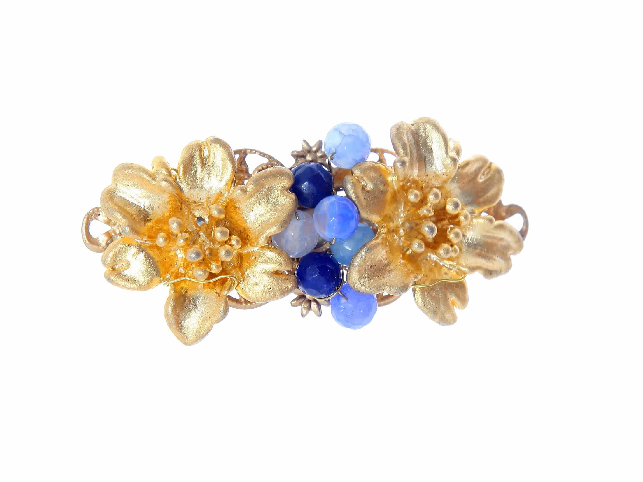 Broche con dos flores y bolas de piedra Ágata en tonos azules. Medidas aproximadas ancho x largo; 6,5 x 2,5 cm. Fabricado artesanalmente en la provincia de Sevilla.