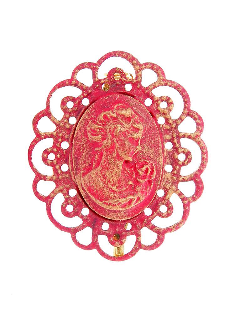 Broche de flamenca camafeo fresa con reflejos oro, con medidas de 35x 40 mm, fornitura metálica de filigrana y alfiler ideal para la sujeción del mantoncillo al traje de flamenca. Fabricado artesanalmente en Sevilla.