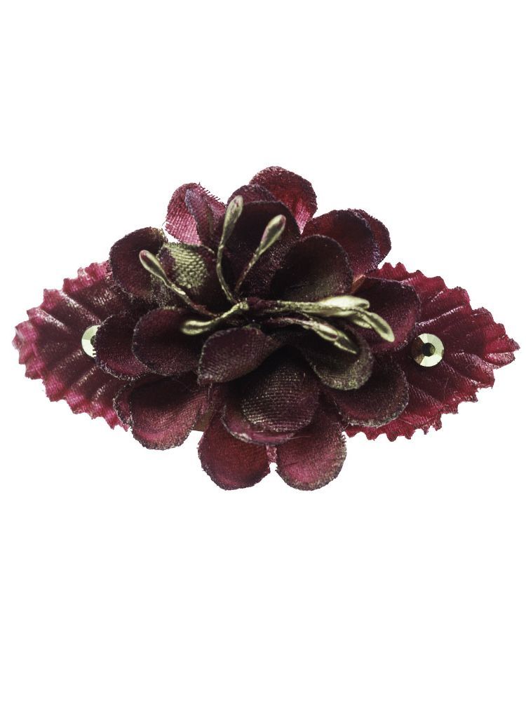 Broche de flamenca flor de tela granate con reflejo dorado. Medidas de 65×30 mm. Alfiler ideal para la sujeción del mantoncillo al traje de flamenca. Fabricado artesanalmente en Sevilla.