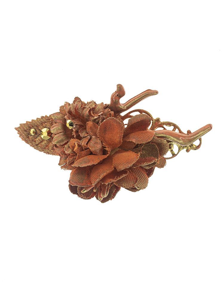 Broche de flamenca de flores de tela, en color coral con reflejos oro, con medidas de 67 x 45 mm, fornitura metálica de filigrana y alfiler ideal para la sujeción del mantoncillo al traje de flamenca. Fabricado artesanalmente en Sevilla.