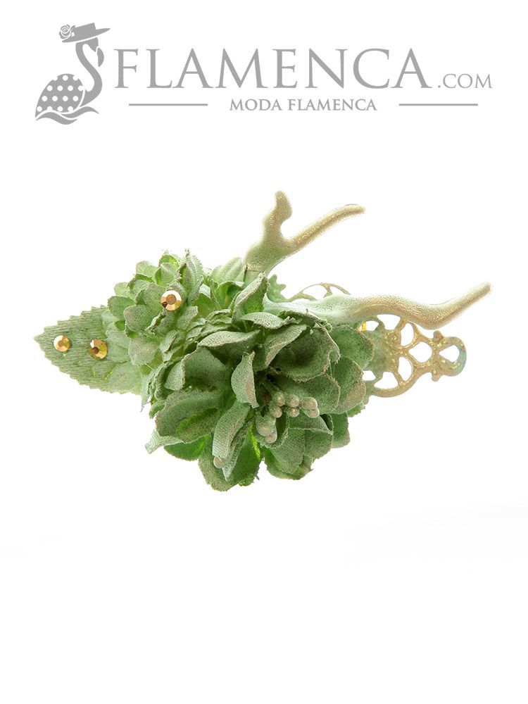 Broche de flamenca de flores de tela, en color verde pálido con reflejos oro, con medidas de 67 x 45 mm, fornitura metálica de filigrana y alfiler ideal para la sujeción del mantoncillo al traje de flamenca. Fabricado artesanalmente en Sevilla.