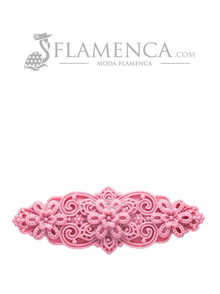 Broche de flamenca de resina color malva antiguo, de estilo floral tallado y unas medidas de 78 x 28 mm . Dispone de alfiler para sujetar el mantoncillo al traje de flamenca. Fabricado artesanalmente en Sevilla.