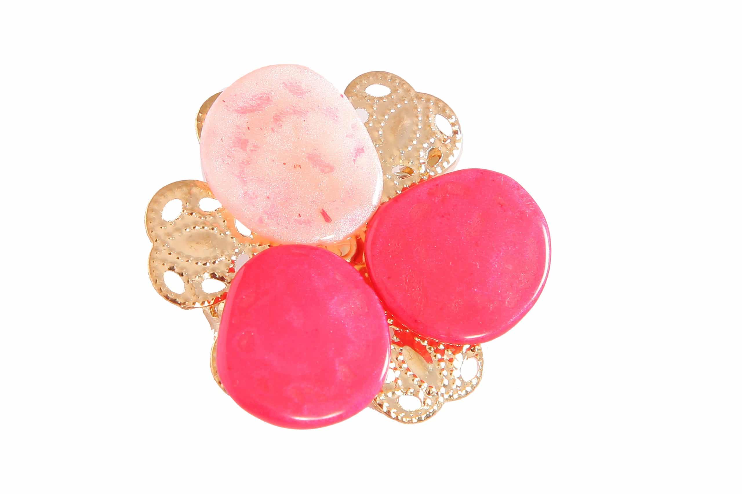 Broche de flamenca flor mediana piedras nácar color rosa bebé y fresa. Medida 35×30 mm. Cierre mediante imperdible. Fabricado artesanalmente en la provincia de Sevilla.