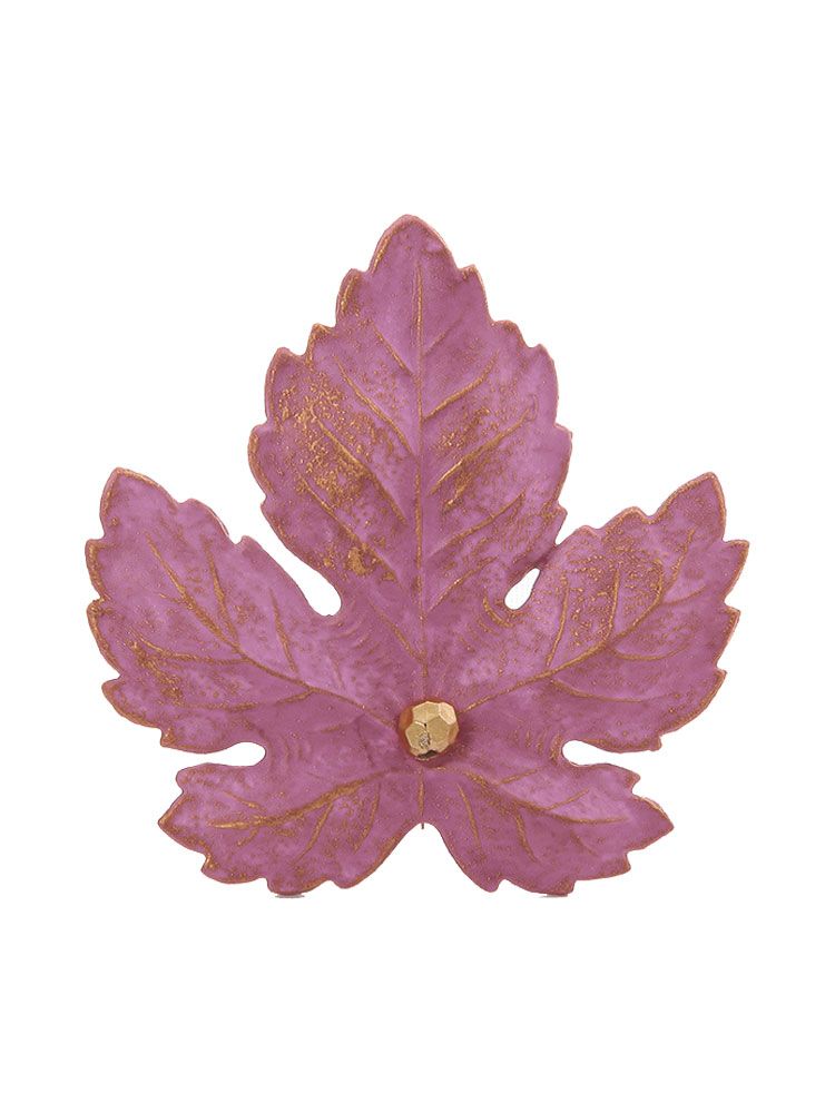 Broche de flamenca hoja pintada en rosa chicle con reflejos dorados y detalle piedra teñida en tono oro, con medidas de 40 x 45 mm, fornitura metálica y alfiler ideal para la sujeción del mantoncillo al traje de flamenca. Fabricado artesanalmente en Sevilla.