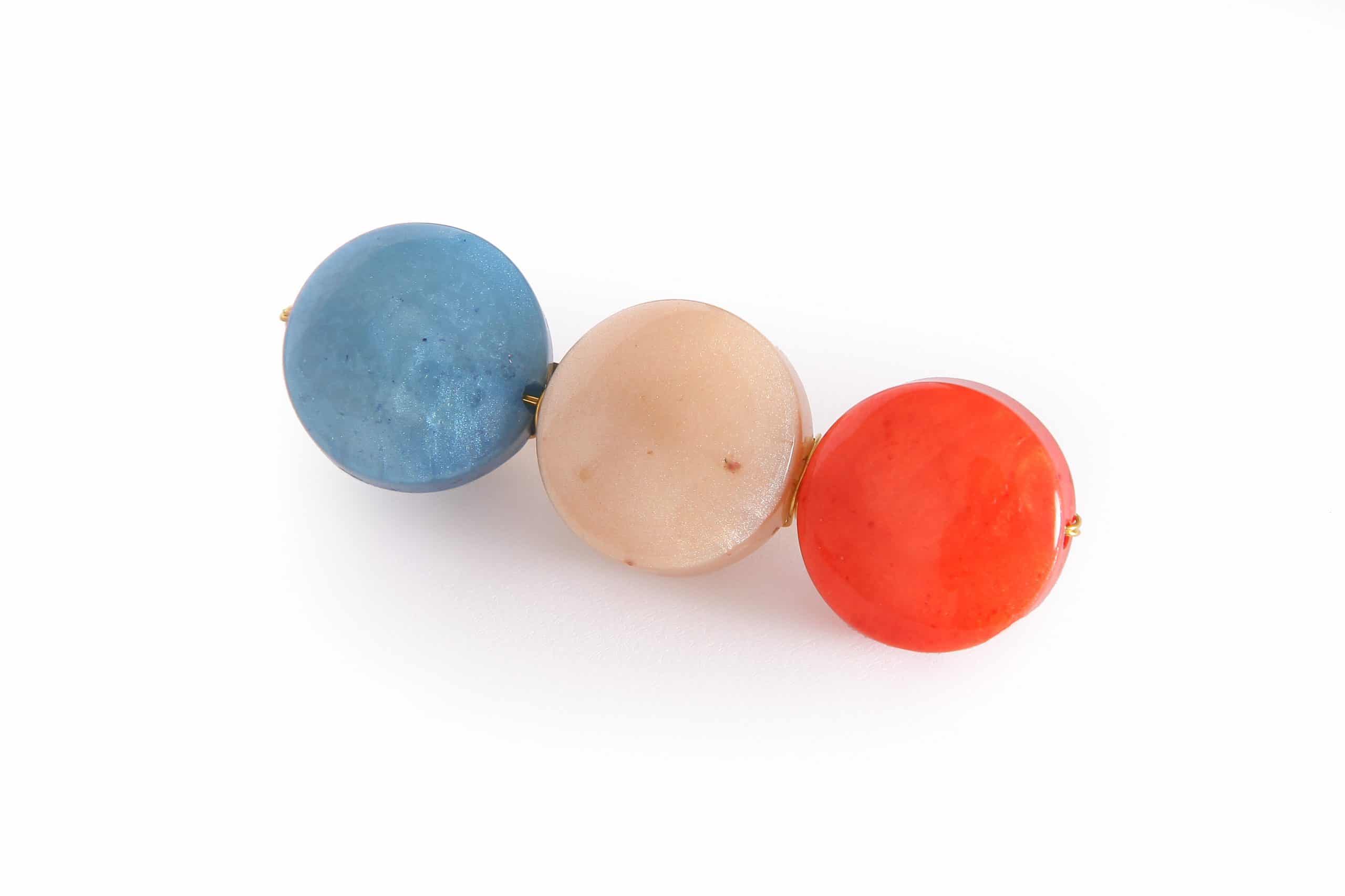 Broche de flamenca mediano piedras nácar color azul ducado, beige y coral. Medida 55×17 mm. Cierre mediante imperdible. Fabricado artesanalmente en la provincia de Sevilla.