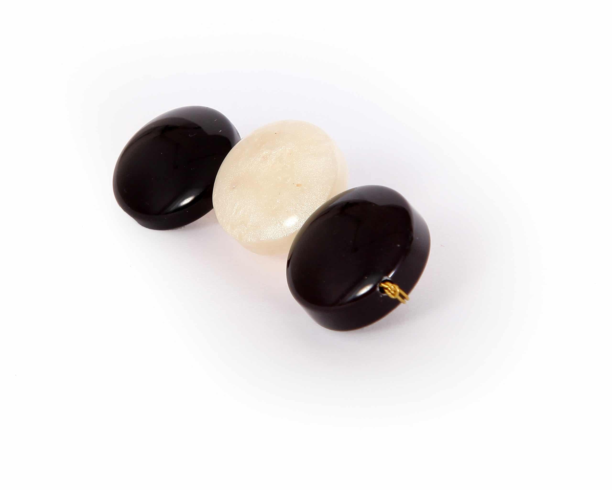 Broche de flamenca mediano piedras nácar color negro y marfil. Medida 55×17 mm. Cierre mediante imperdible. Fabricado artesanalmente en la provincia de Sevilla.