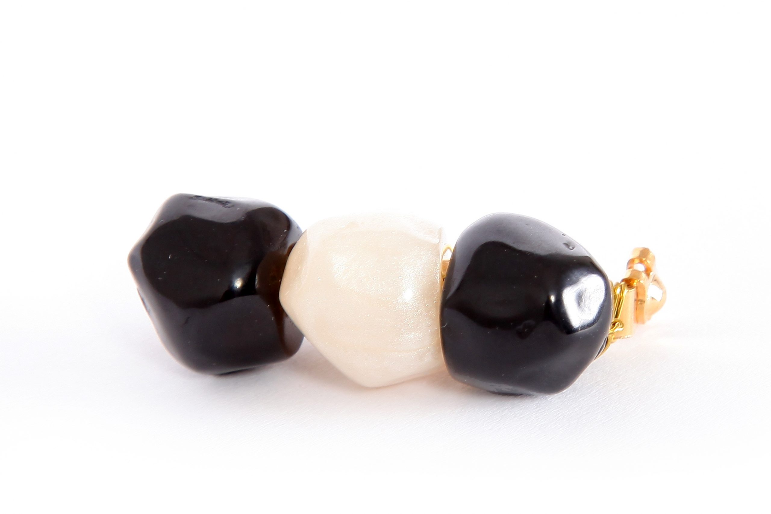 Broche de flamenca pequeño piedras nácar color negro y marfil. Medida 40×15 mm. Cierre mediante imperdible. Fabricado artesanalmente en la provincia de Sevilla.