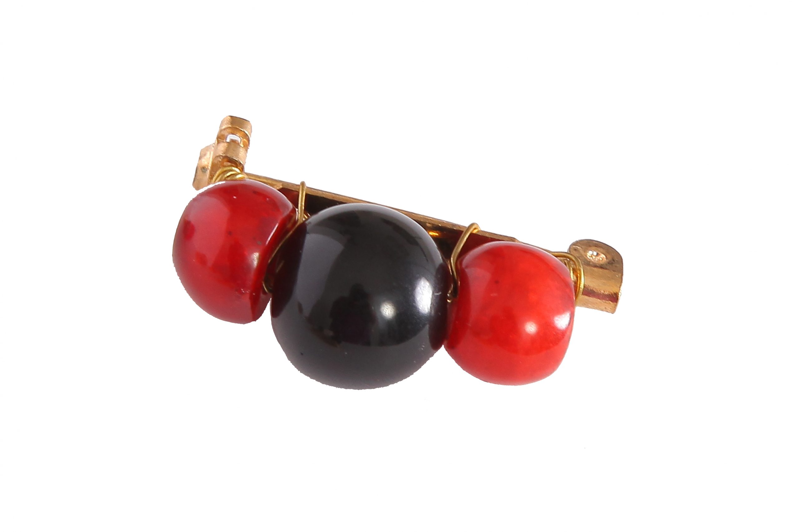 Broche de flamenca pequeño piedras nácar color rojo y negro. Medida 25×12 mm. Cierre mediante imperdible. Fabricado artesanalmente en la provincia de Sevilla.