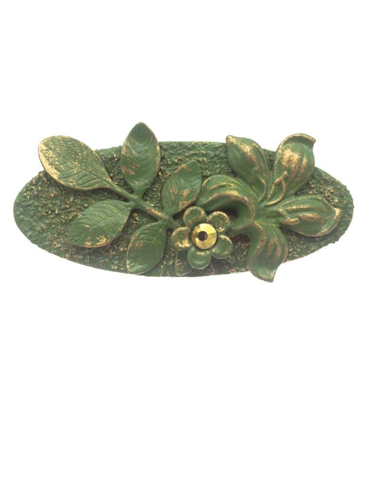 Broche de flamenca verde agua con fornitura metálica y reflejos dorados. Medidas 55×20 mm. Alfiler ideal para la sujeción del mantoncillo al traje de flamenca. Fabricado artesanalmente en Sevilla.
