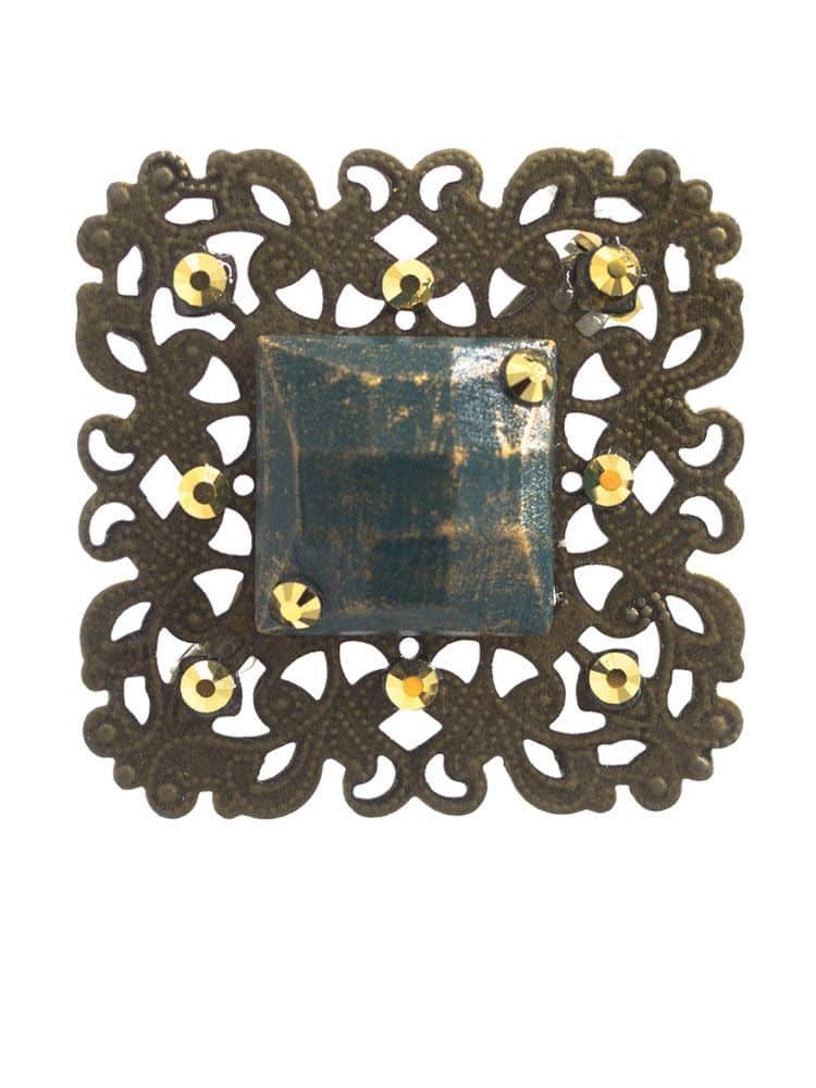 Broche de flamenca verde botella con fornitura metálica y reflejos dorados. Medidas 50×50 mm. Alfiler ideal para la sujeción del mantoncillo al traje de flamenca. Fabricado artesanalmente en Sevilla.