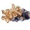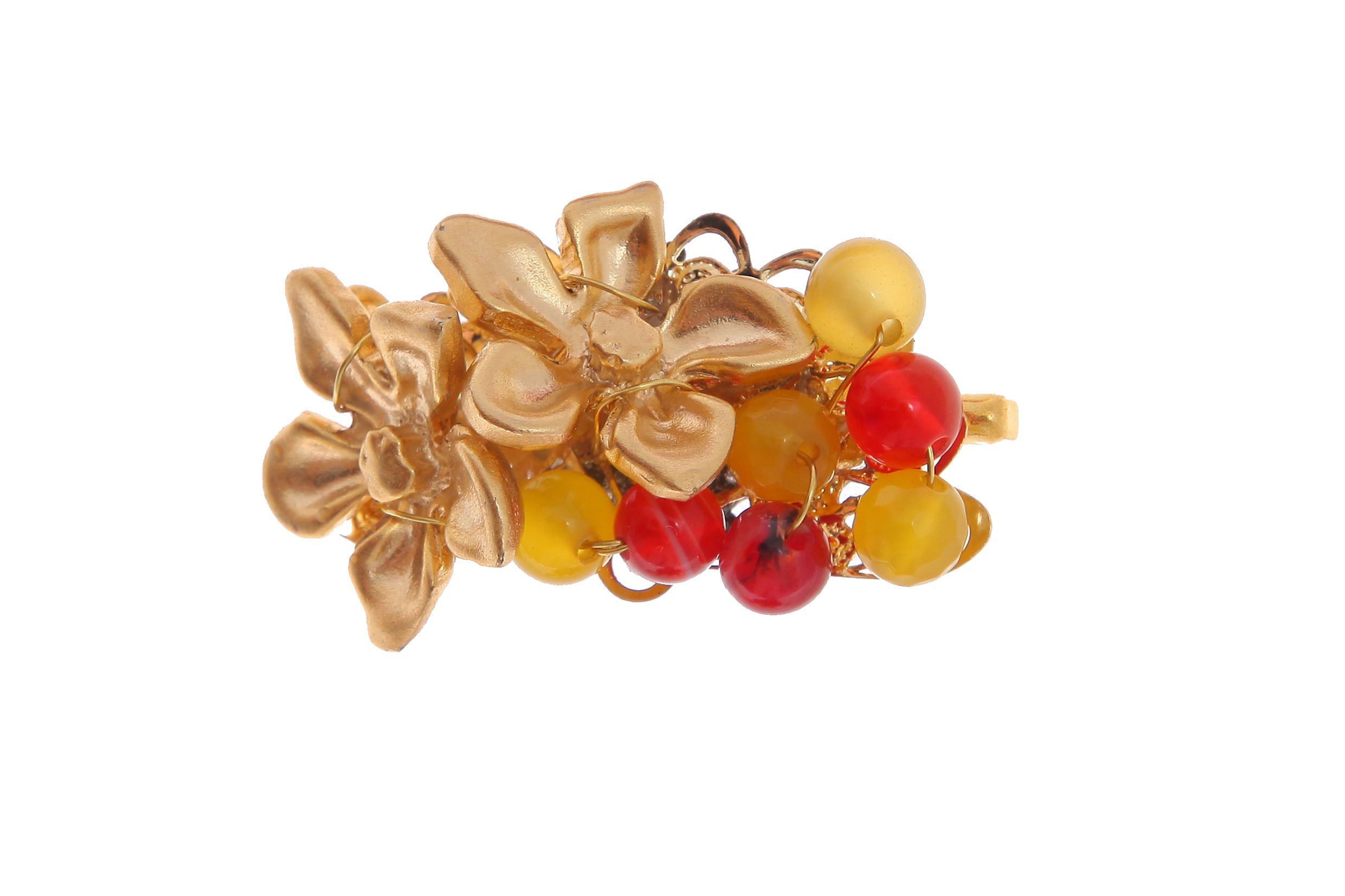 Broche de flores en dorado mate y bolas de piedra Ágata en tonos naranja y amarillo. Medidas aproximadas ancho x largo; 4,5 x 2,5 cm. Fabricado artesanalmente en la provincia de Sevilla.
