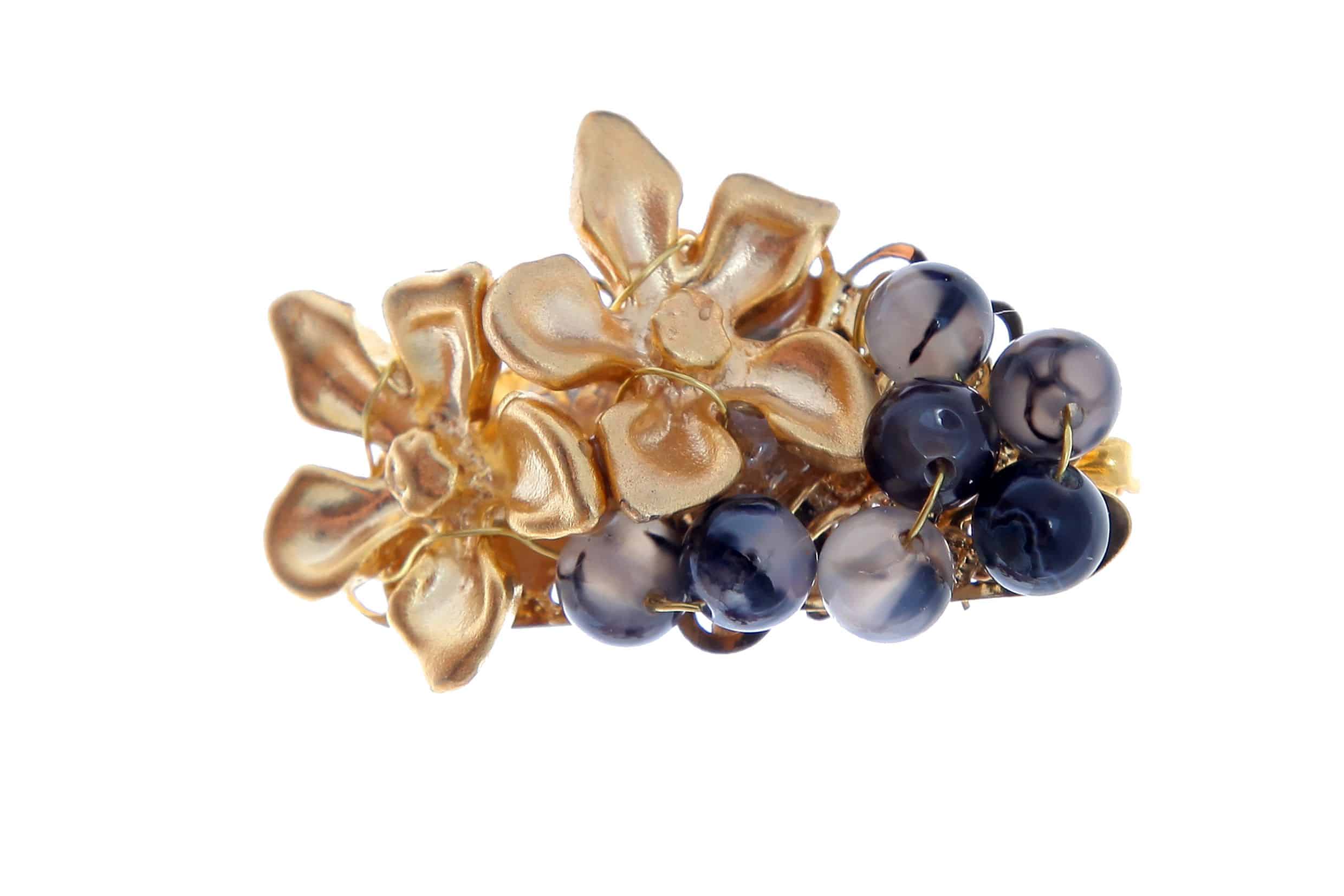 Broche de flores en dorado mate y bolas de piedra Ágata en tonos negros y blancos. Medidas aproximadas ancho x largo; 4,5 x 2,5 cm. Fabricado artesanalmente en la provincia de Sevilla.