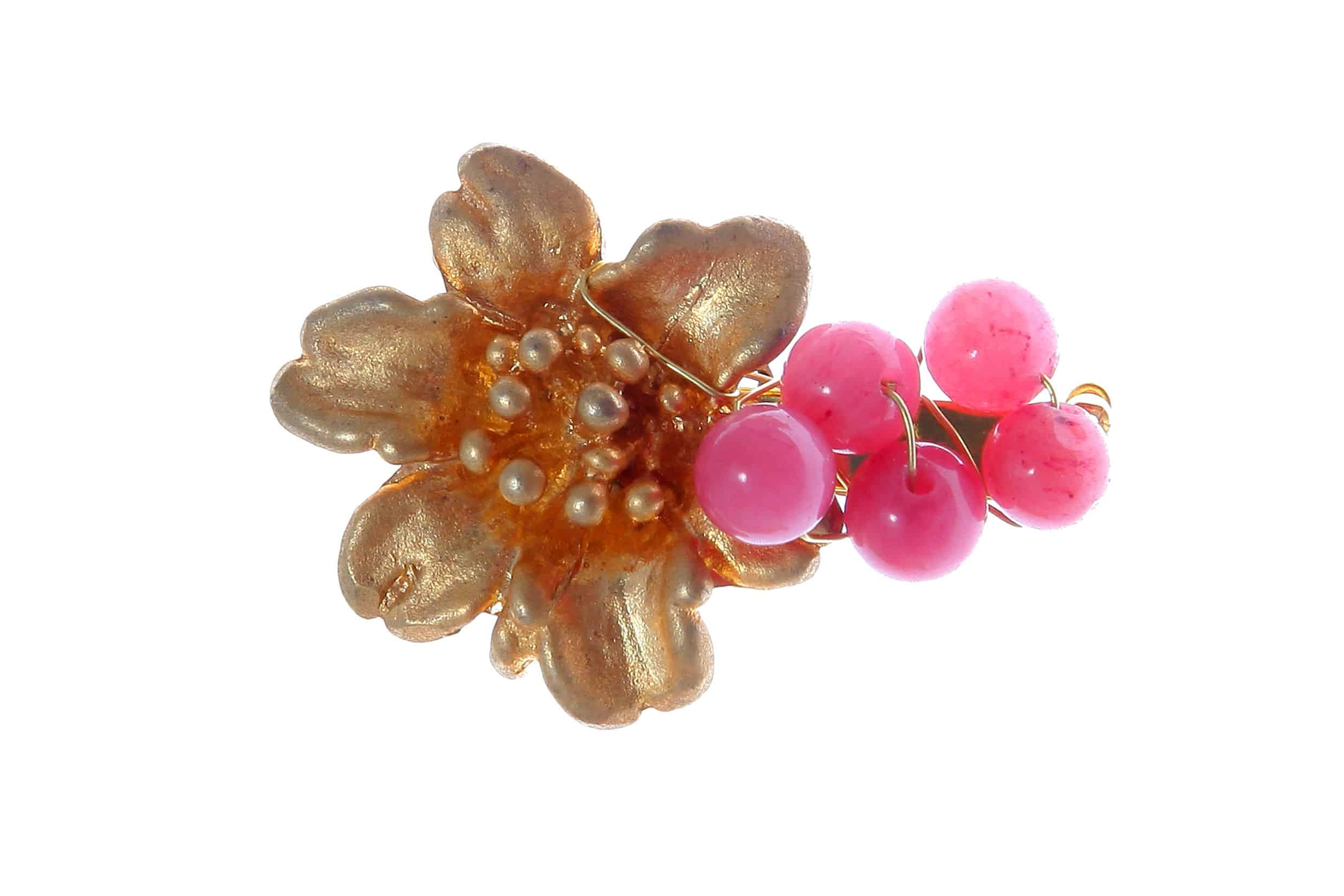 Broche dorado de flor con bolas de piedra Ágata en tonos rosa bebé. Medidas aproximadas ancho x largo; 4 x 2,8 cm. Fabricado artesanalmente en la provincia de Sevilla.
