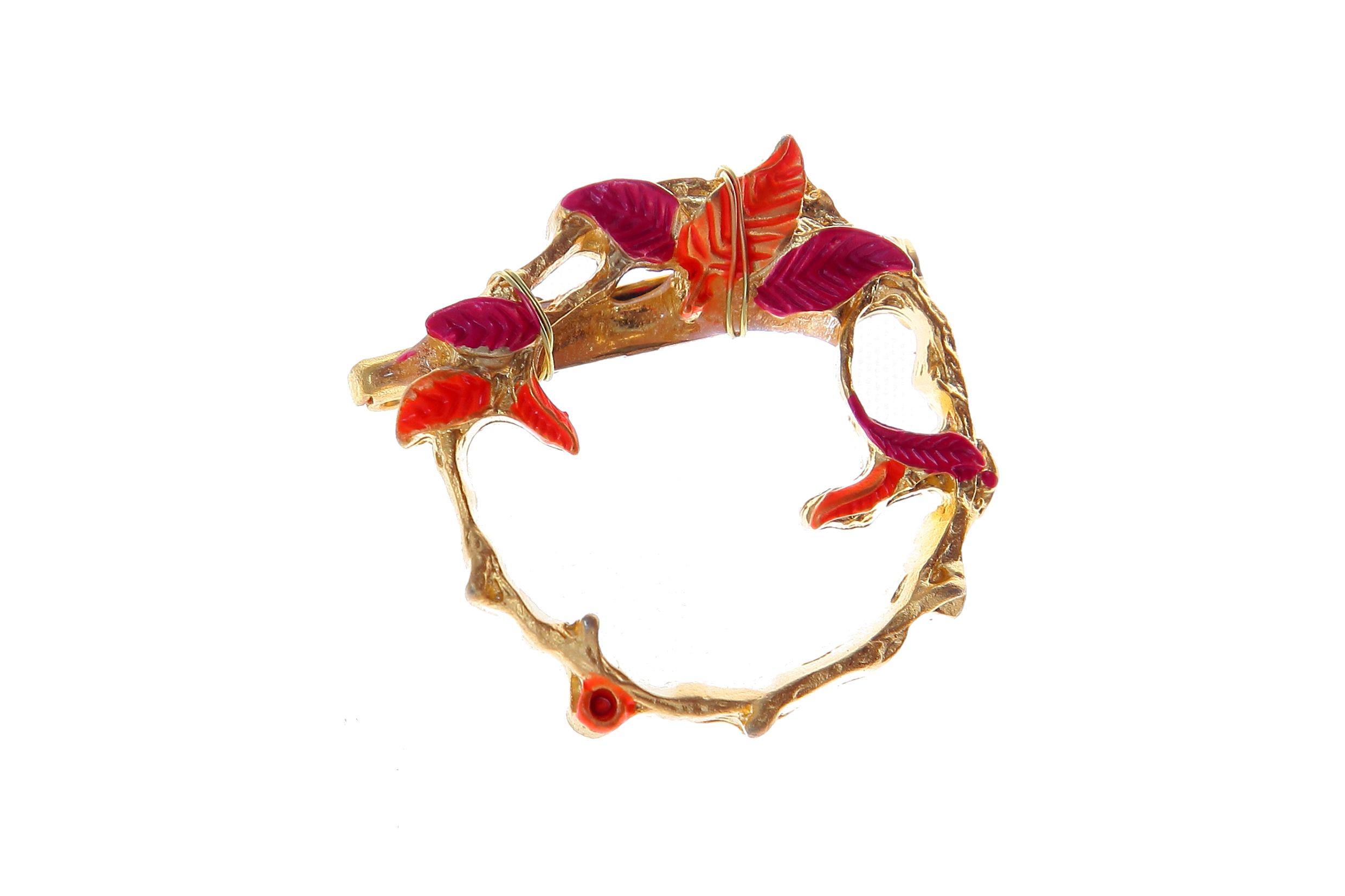 Broche dorado en mate de hojas pintado en naranja y rosa. Medidas aproximadas ancho x largo; 3,5 x 3,5 cm. Fabricado artesanalmente en la provincia de Sevilla.