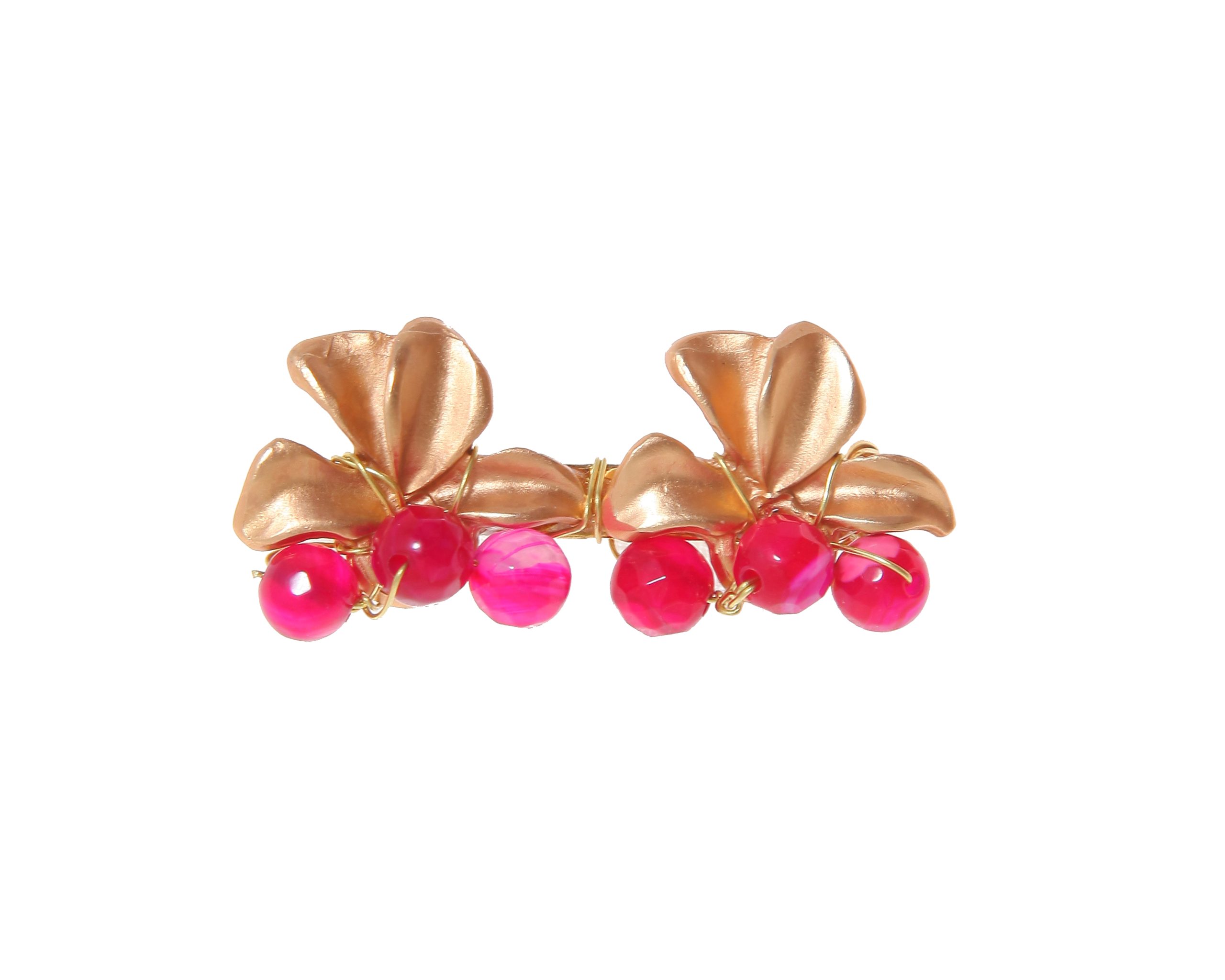 Broche dorado de hojas con bolas de piedra Ágata en buganvilla. Medidas aproximadas ancho x largo; 50x20mm. Fabricado artesanalmente en la provincia de Sevilla.