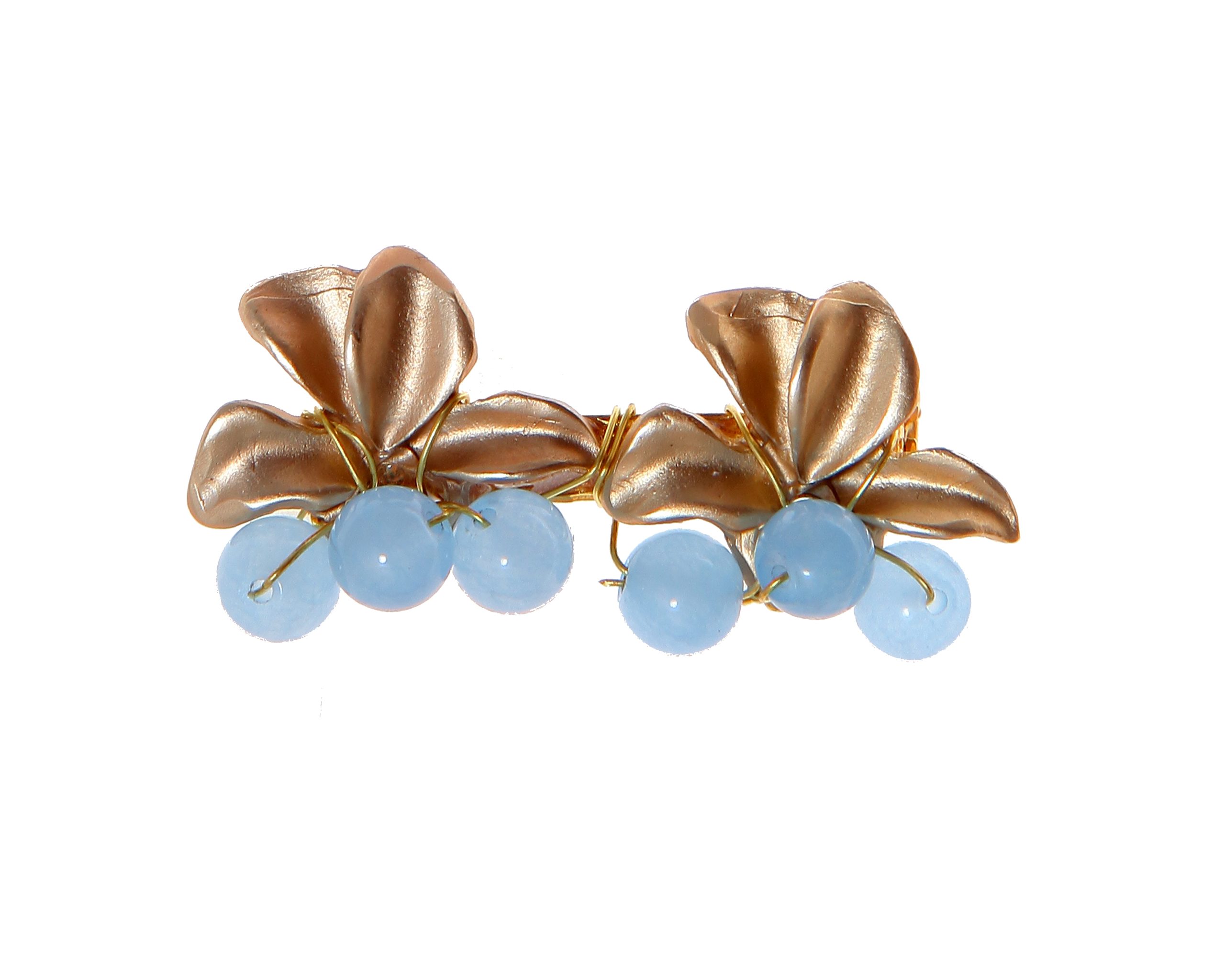 Broche dorado de hojas con bolas de piedra Ágata en celeste