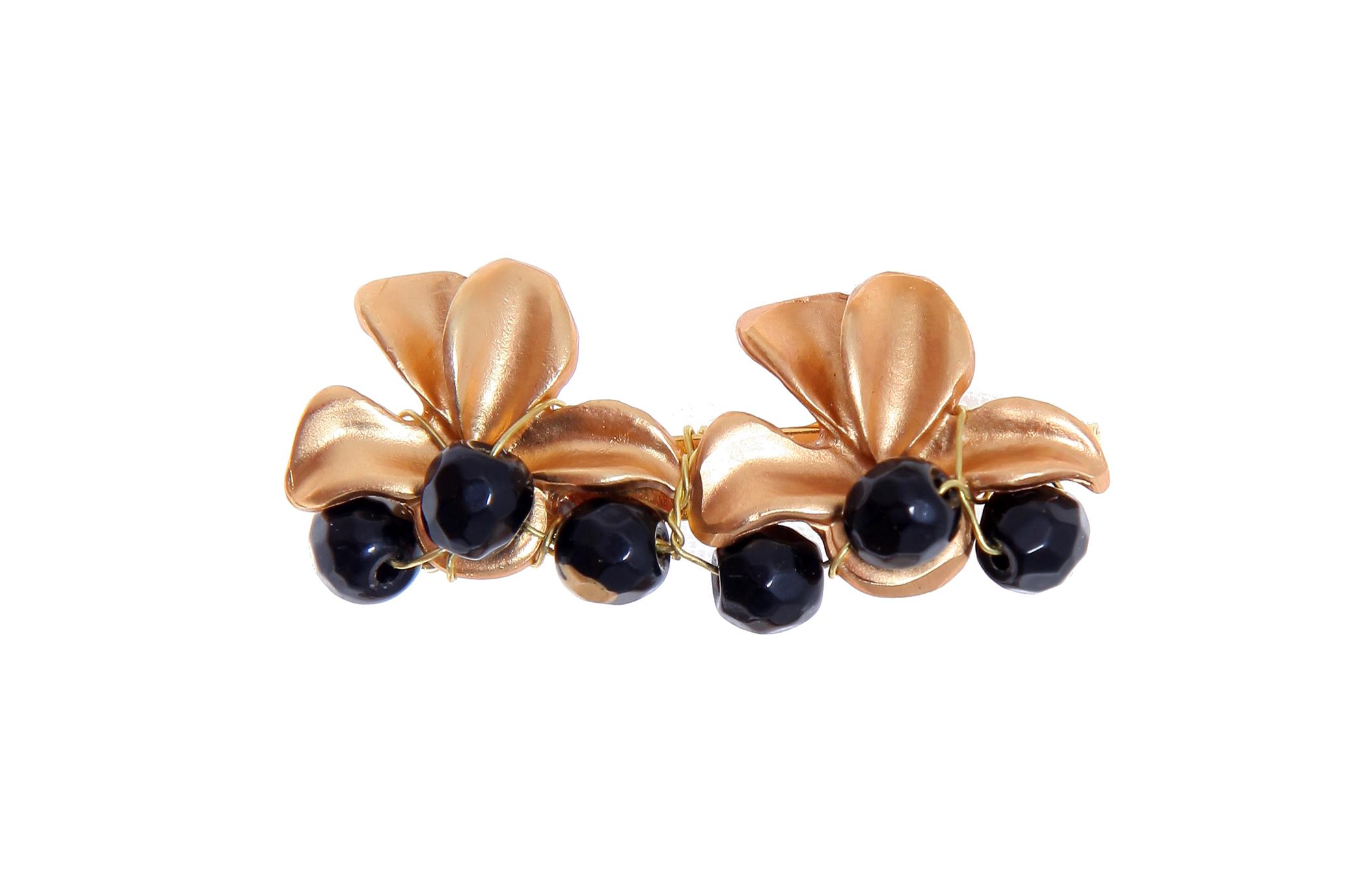 Broche dorado de hojas con bolas de piedra Ágata en negro. Medidas aproximadas ancho x largo; 50x20mm. Fabricado artesanalmente en la provincia de Sevilla.