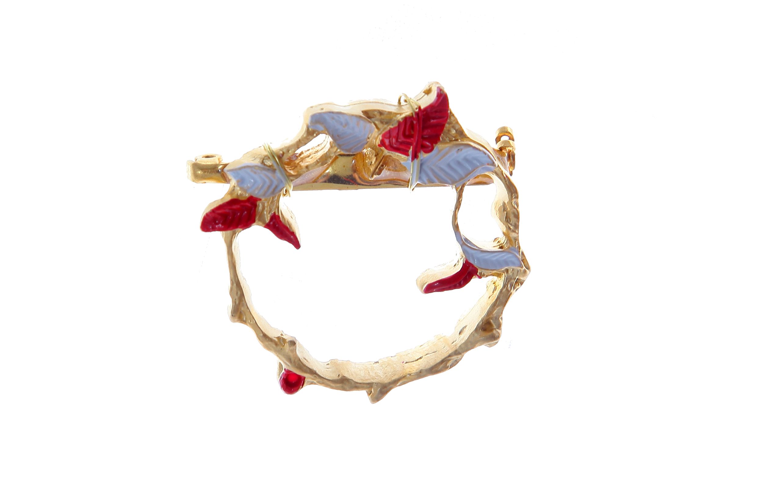 Broche dorado en mate de hojas pintado en blanco y rojo. Medidas aproximadas ancho x largo; 3,5 x 3,5 cm. Fabricado artesanalmente en la provincia de Sevilla.