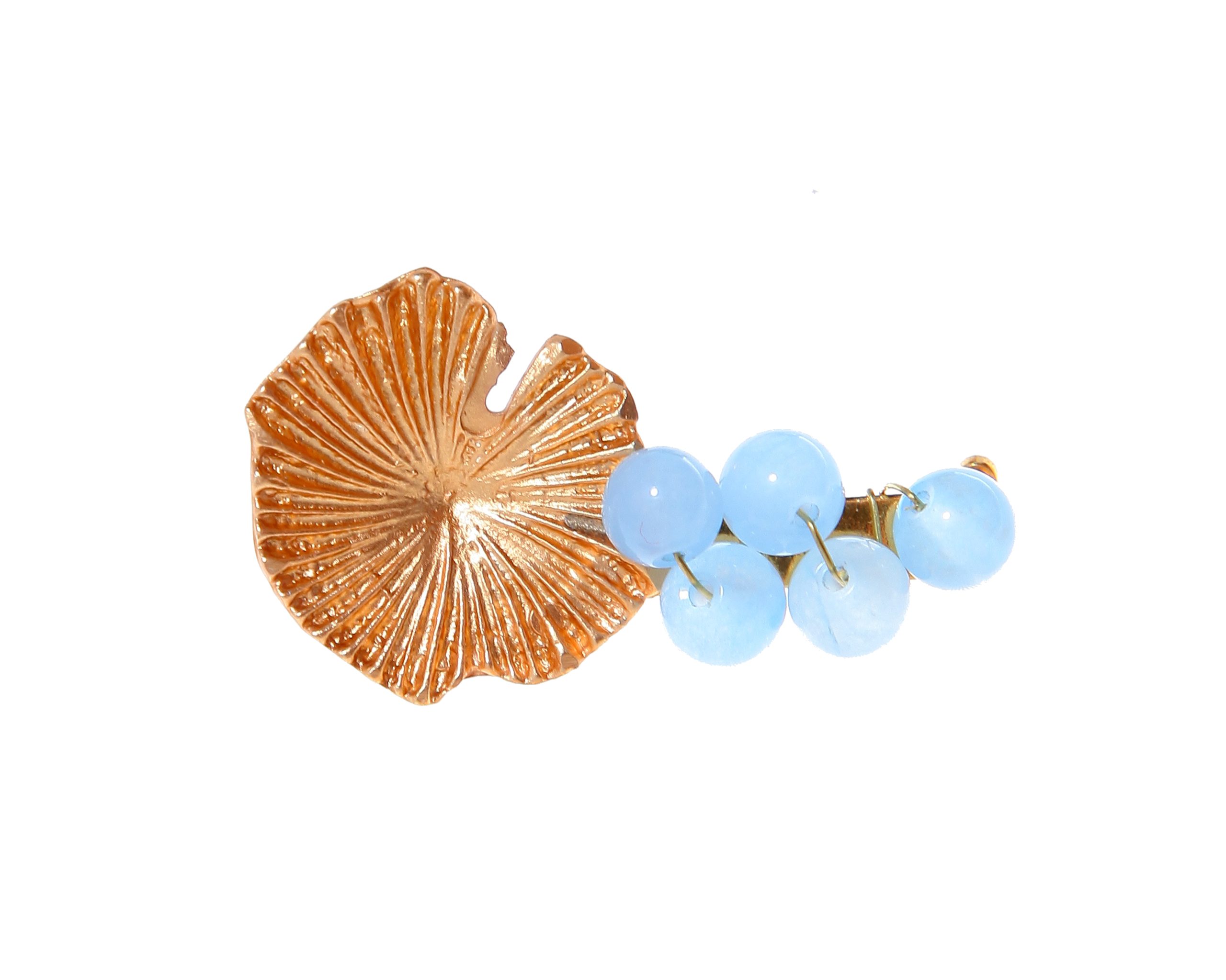 Broche dorado de nenúfar con bolas de piedra Ágata en celeste. Medidas aproximadas ancho x largo; 45x25mm. Fabricado artesanalmente en la provincia de Sevilla.