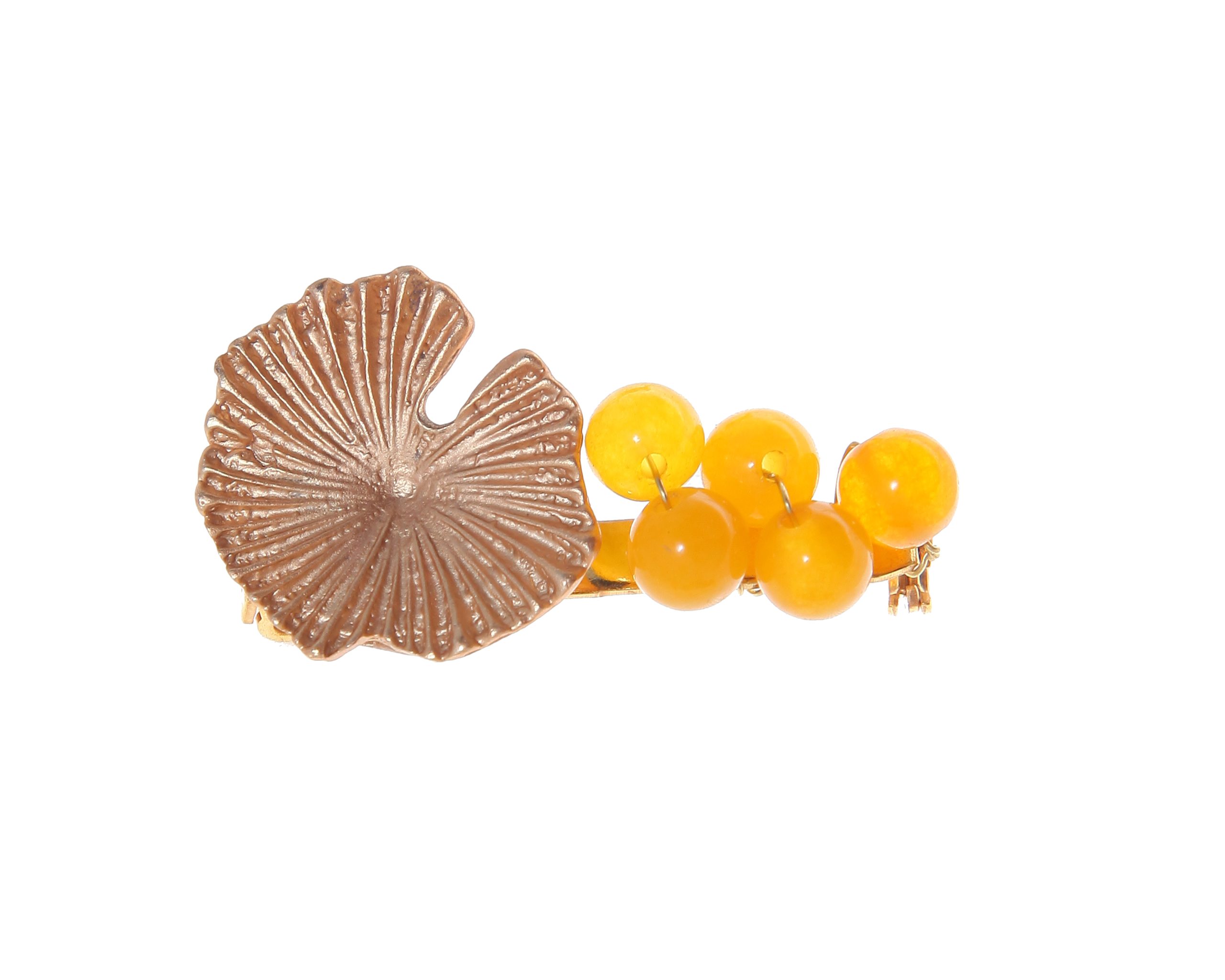 Broche dorado de nenúfar con bolas de piedra Ágata en mostaza. Medidas aproximadas ancho x largo; 45x25mm. Fabricado artesanalmente en la provincia de Sevilla.