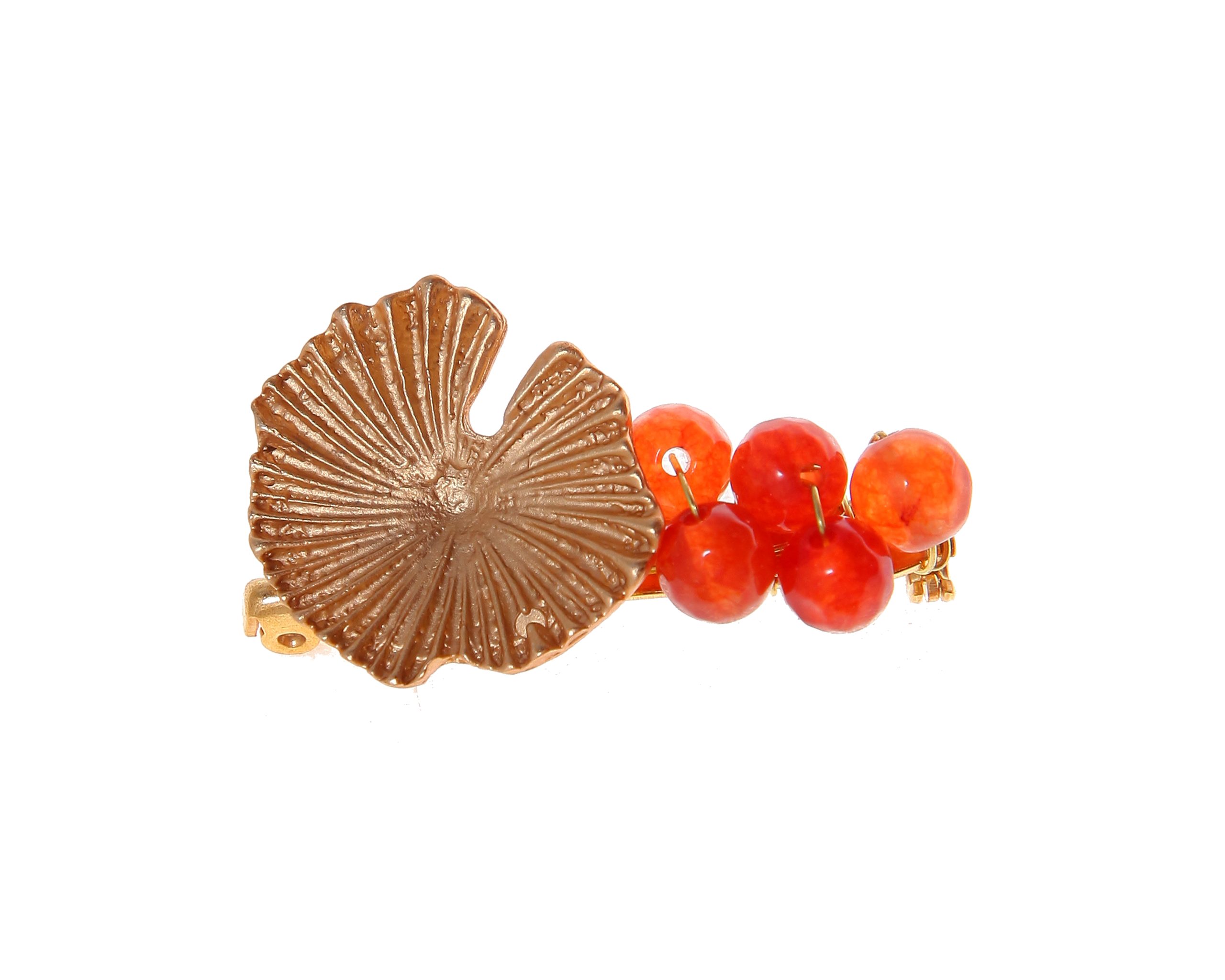 Broche dorado de nenúfar con bolas de piedra Ágata en tonos naranjas. Medidas aproximadas ancho x largo; 45x25mm. Fabricado artesanalmente en la provincia de Sevilla.