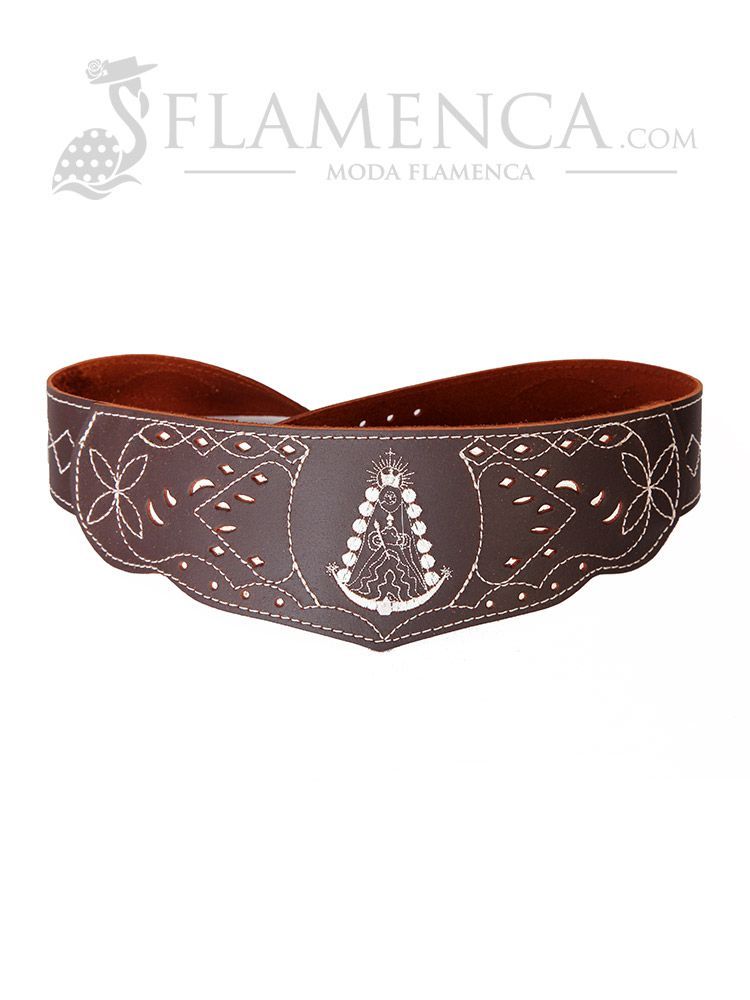 Cinturón fajín de niña en piel picado, color marrón engrasado, con motivo de la virgen del rocío bordado y terminaciones picadas sobre fondo blanco, con cierre de hebilla, y unas medidas de: 8 x 81,5 cm (altura x largo).