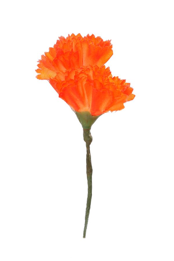 Clavellina de niña de tamaño mini, con un diámetro aproximado de 5 cms y color naranja chillón. Teñidas artesanalmente en Sevilla.