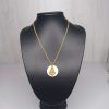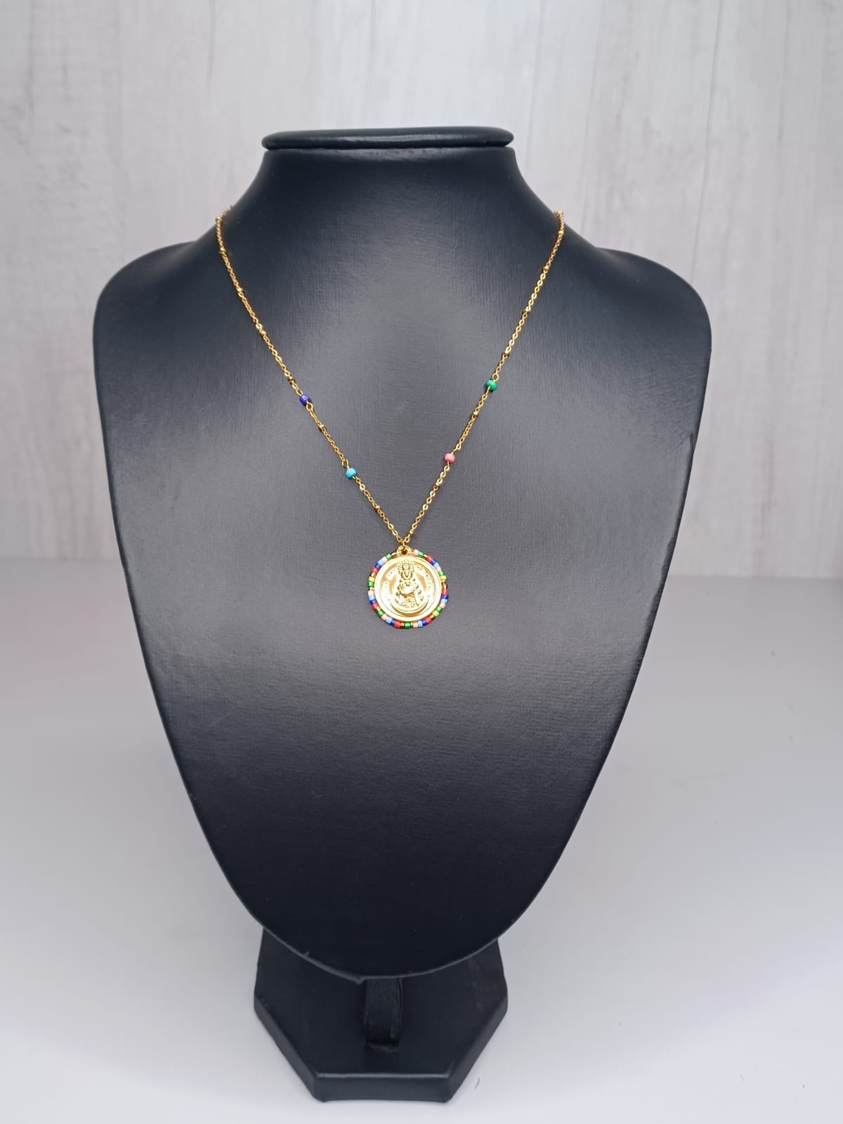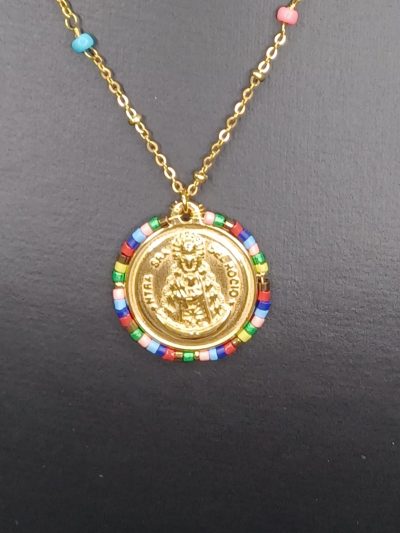 Colgante y cadena de la Virgen del Rocío en color oro con borde de cuentas multicolor. Ideal para romerías y el camino.