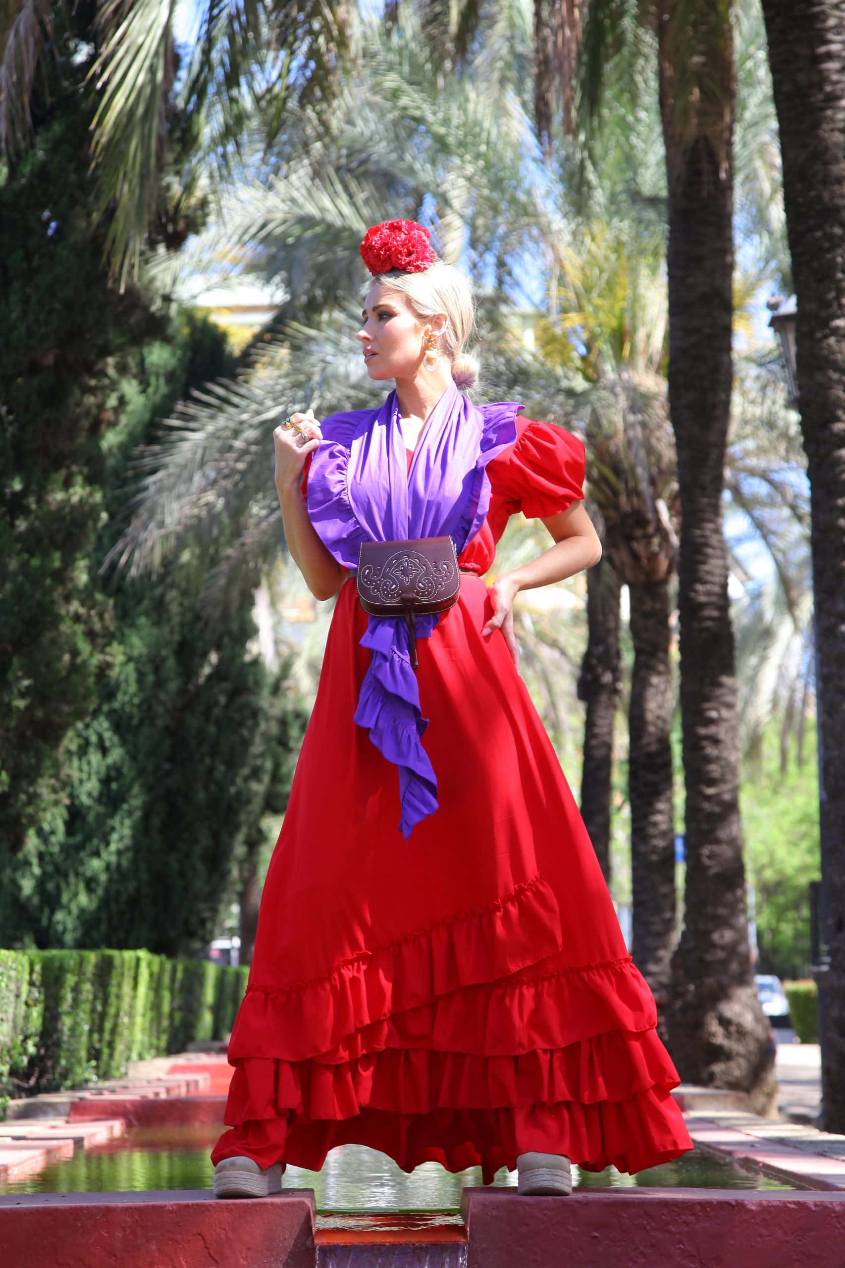 Bata rociera lisa de volantes con media manga abullonada y fruncido en el pecho.