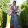 Bata rociera con estampado de cuadros Vichy en tono beige, fruncido en el pecho y volantes con escote de barco.