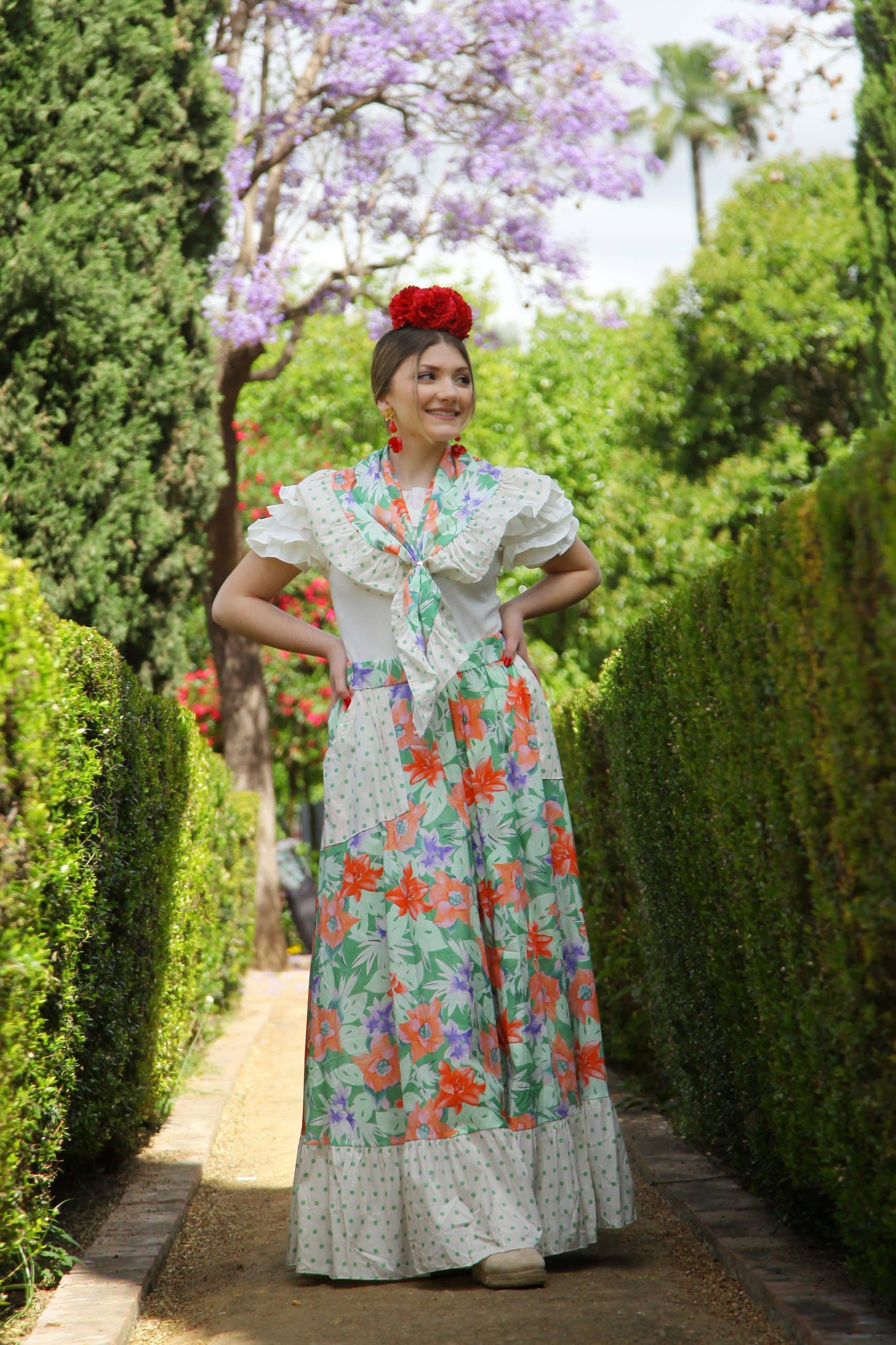 CONJUNTO FALDA + PIQUILLO ESTAMPADO DE FLORES Y LUNARES EN VERDE PÁLIDO
