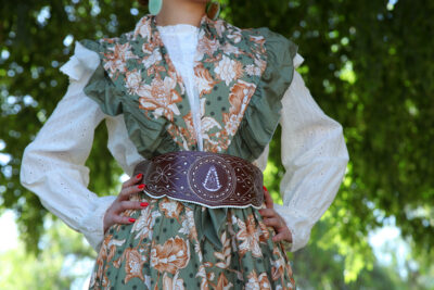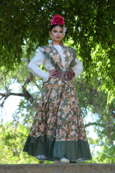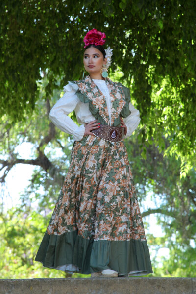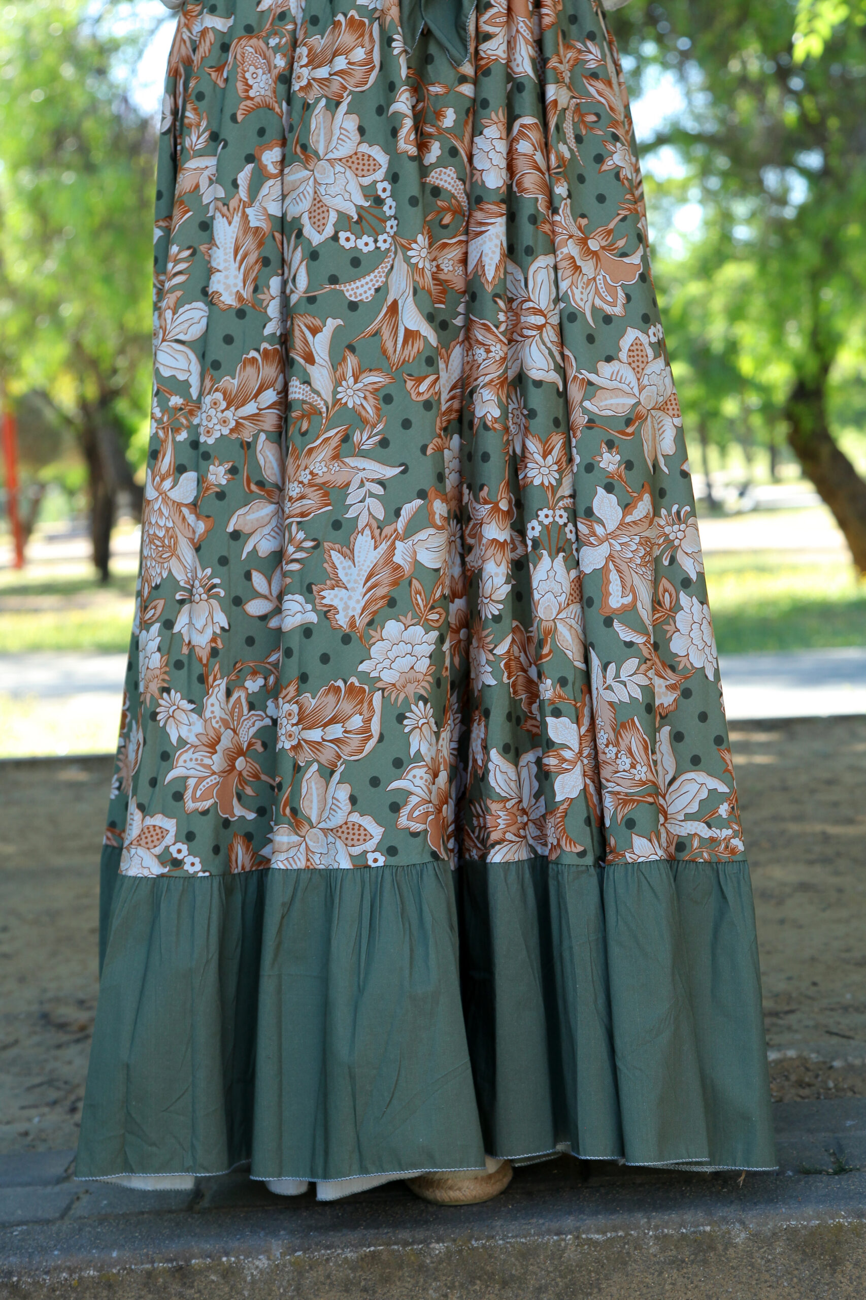 CONJUNTO FALDA + PIQUILLO ESTAMPADO DE LUNARES CAQUI CON FLORES