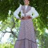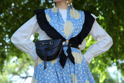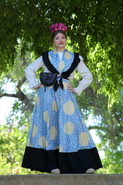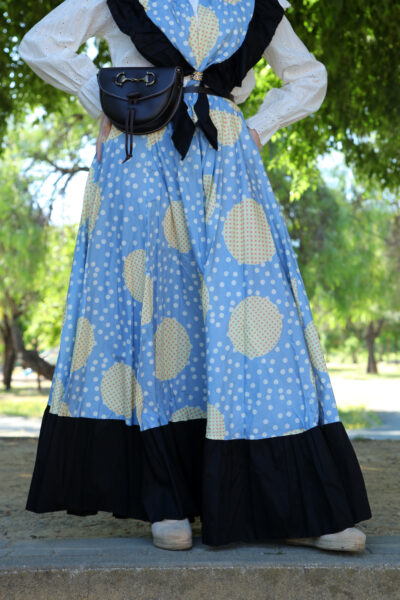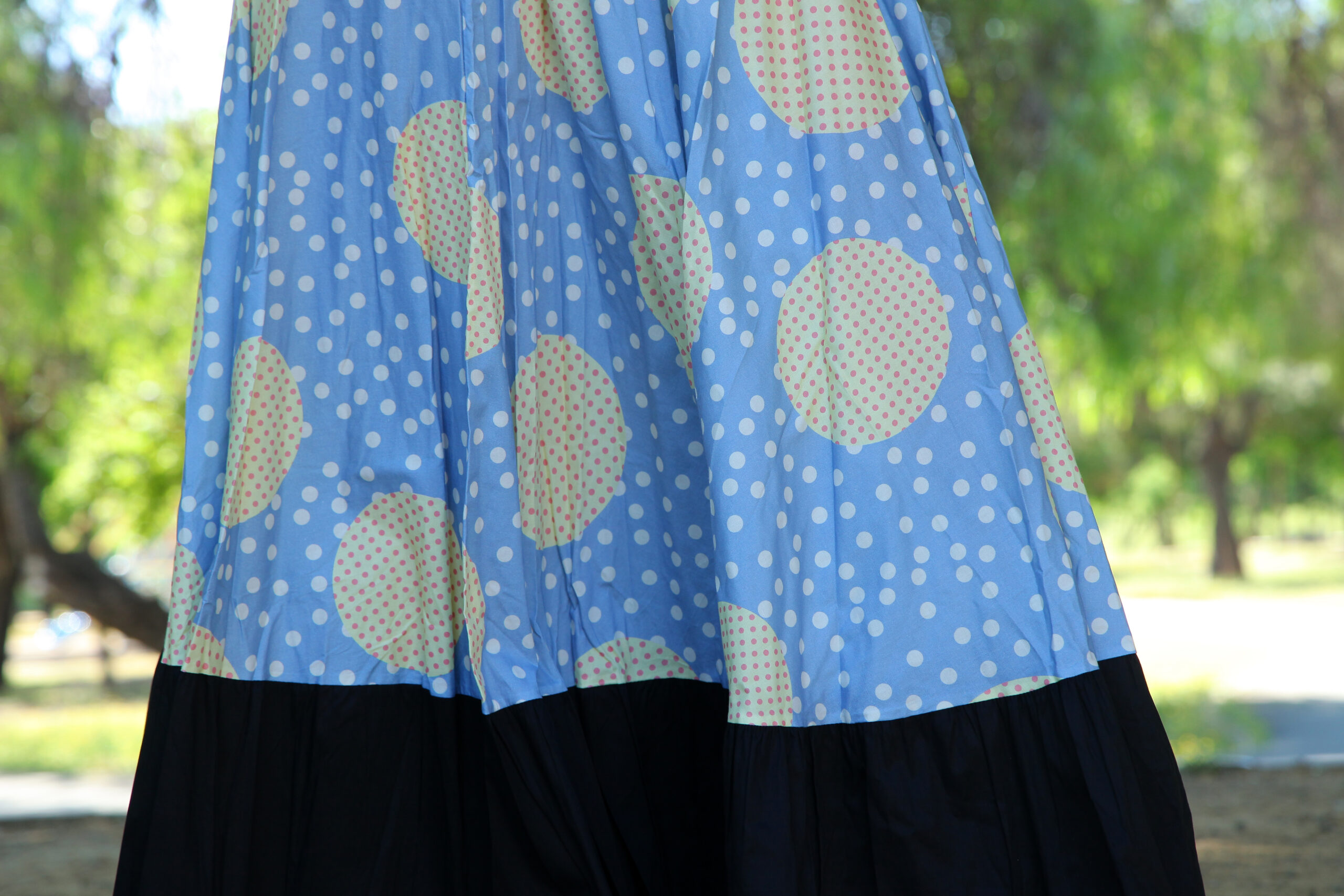 CONJUNTO FALDA + PIQUILLO ESTAMPADO DE LUNARES CELESTE Y AMARILLO
