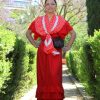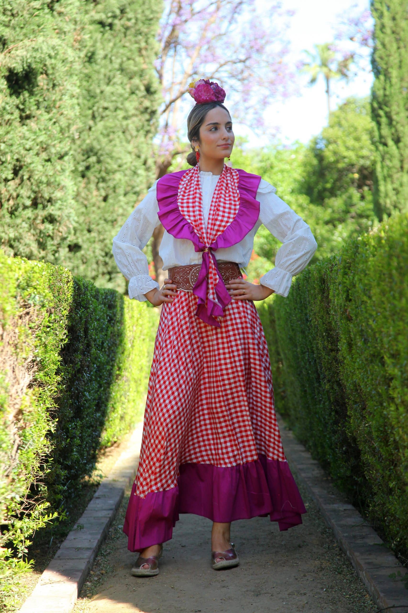 Falda larga de cuadros blancos y rojos con volante buganvilla y cintura elástica. Ideal para el camino y romerías.