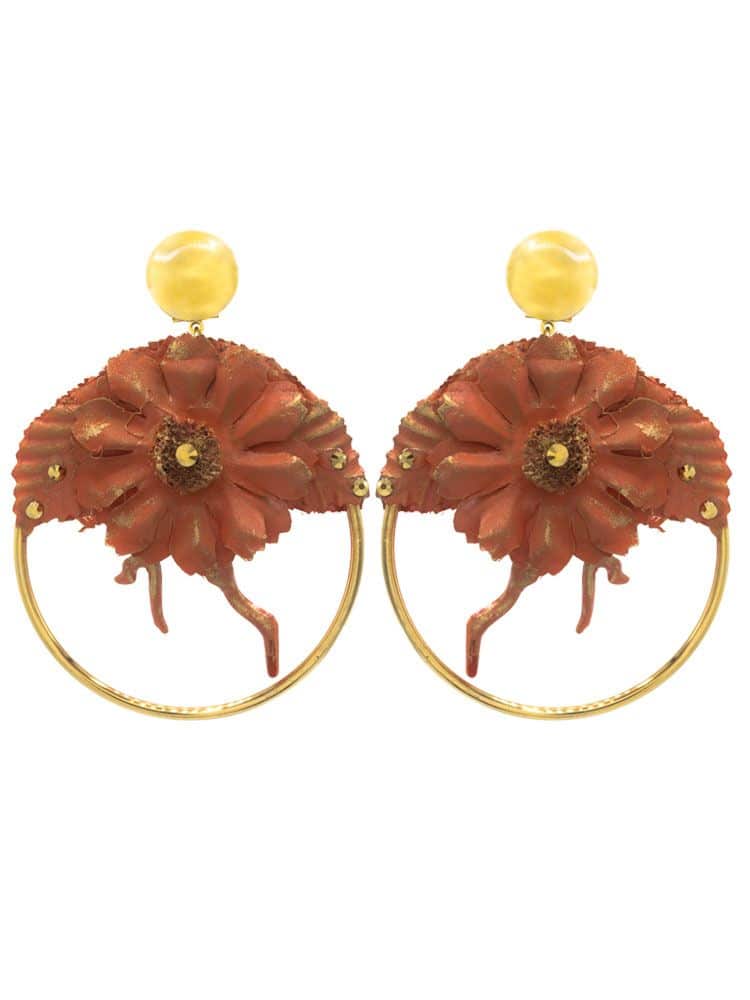 Pendiente de flamenca aro con detalle coral y flor de tela tono coral. Detalles de bolitas metálicas doradas.Cierre omega. Medidas: 65 x 70 mm (sin cabezal). Fabricado artesanalmente en Sevilla.