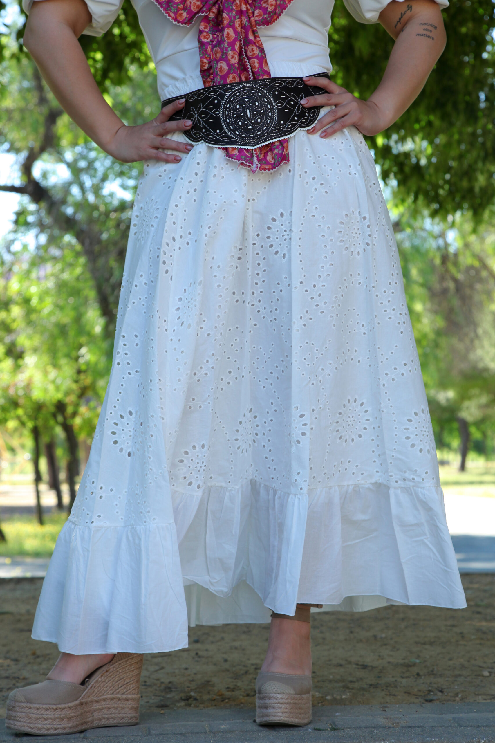 Falda larga troquelada y cintura elástica.Ideal para el camino y romerías.