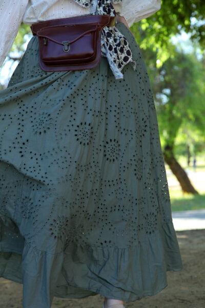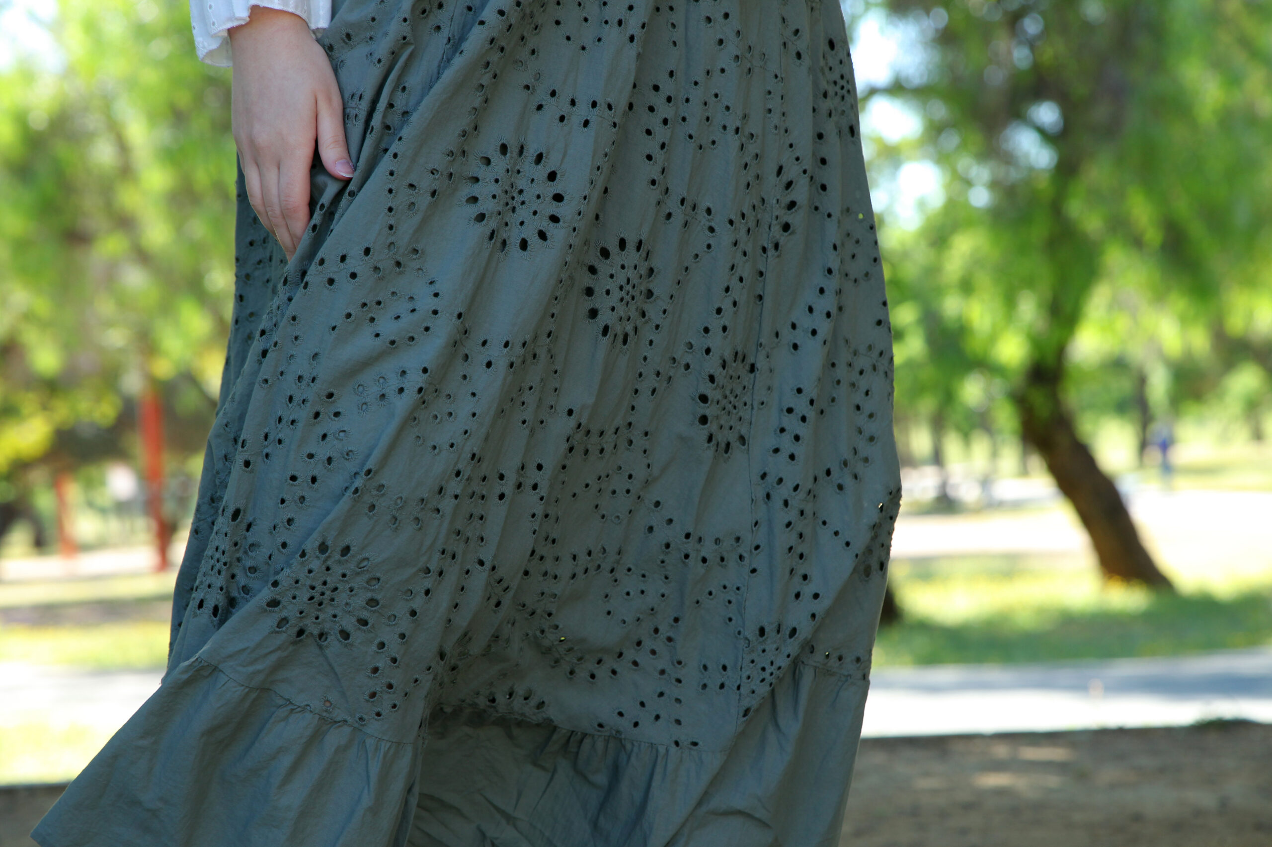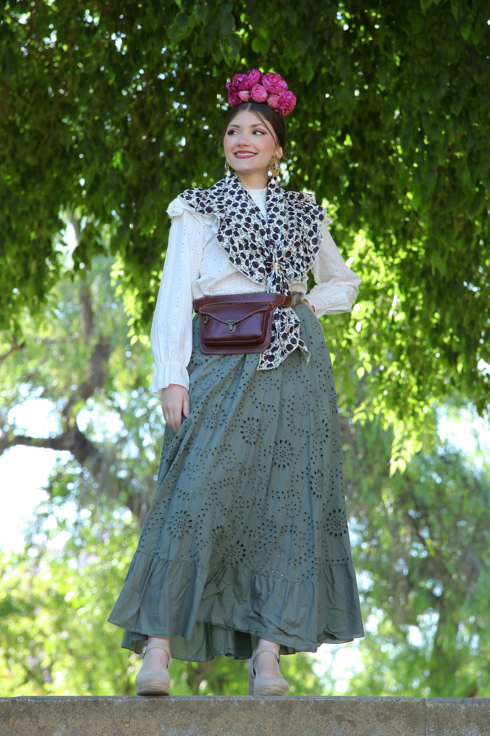 Falda larga troquelada y cintura elástica.Ideal para el camino y romerías.
