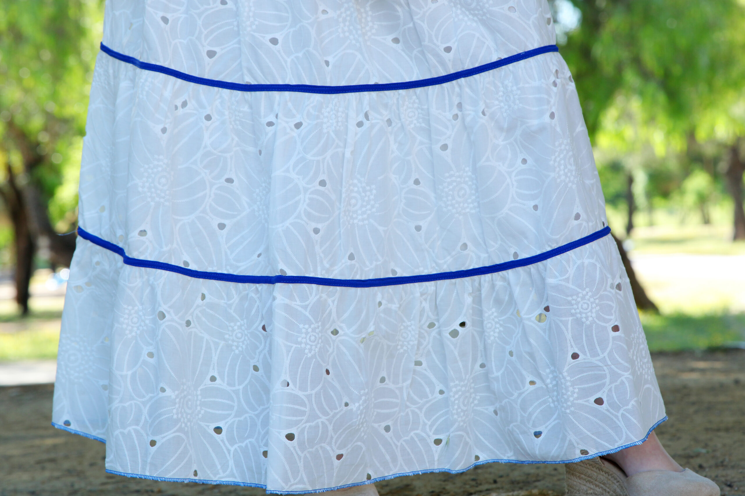 Falda larga troquelada y cintura elástica.Con detalles en terciopelo Ideal para el camino y romerías.