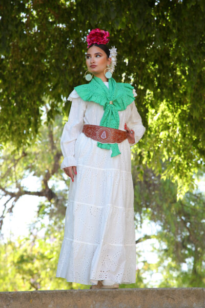 Falda larga troquelada y cintura elástica.Con detalles en terciopelo Ideal para el camino y romerías.