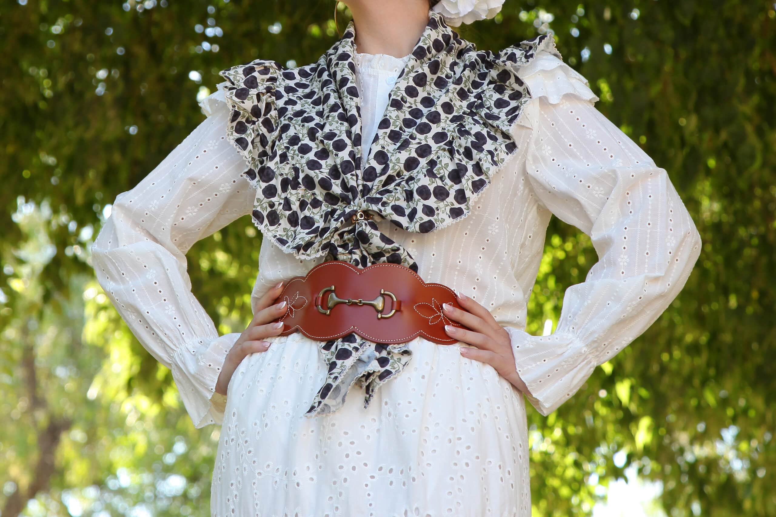 Falda larga troquelada y cintura elástica.Con detalles en terciopelo Ideal para el camino y romerías.