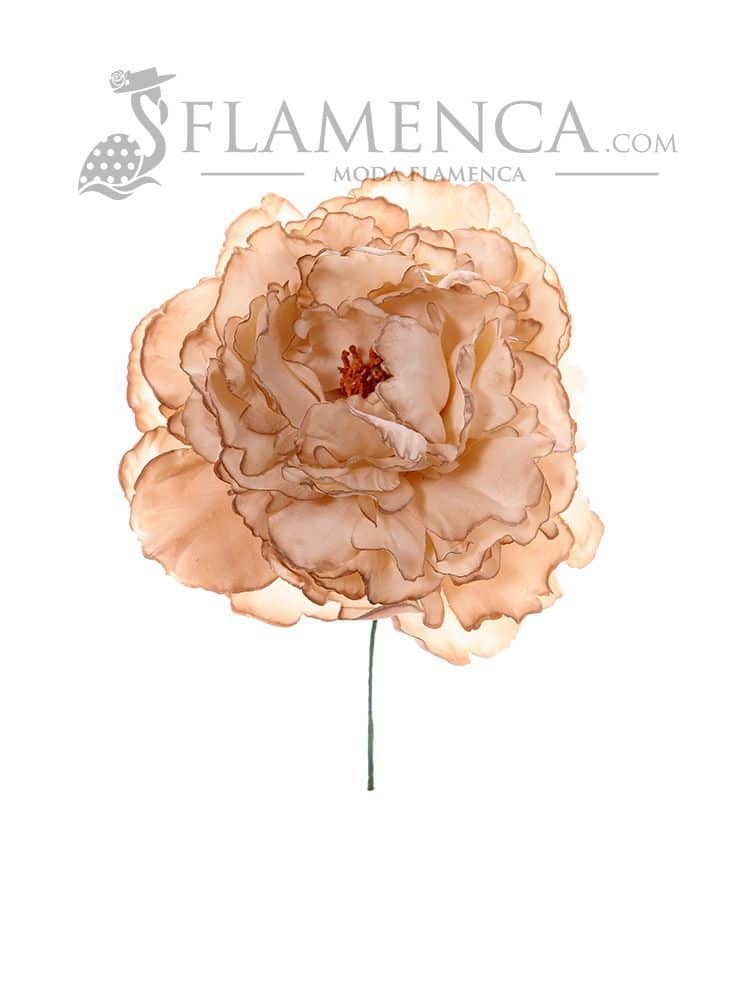 Flor de flamenca estilo peonia, de tamaño grande, con un diámetro aproximado de 14,5 cms y color beige. Elaborada artesanalmente en Sevilla.