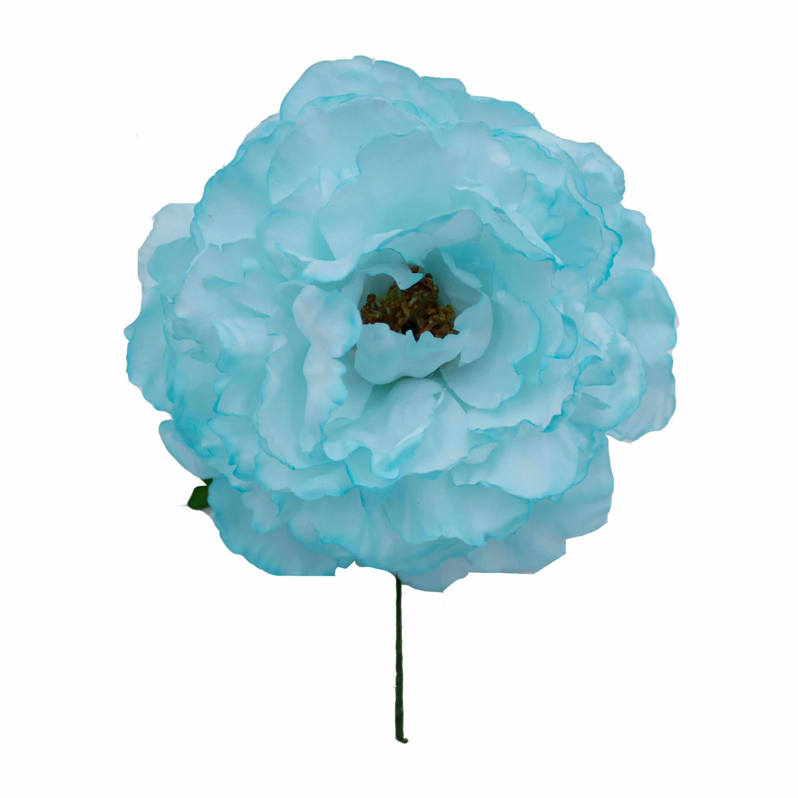 Flor de flamenca estilo peonia, de tamaño grande, con un diámetro aproximado de 14,5 cms y color Aguamarina. Elaborada artesanalmente en Sevilla.